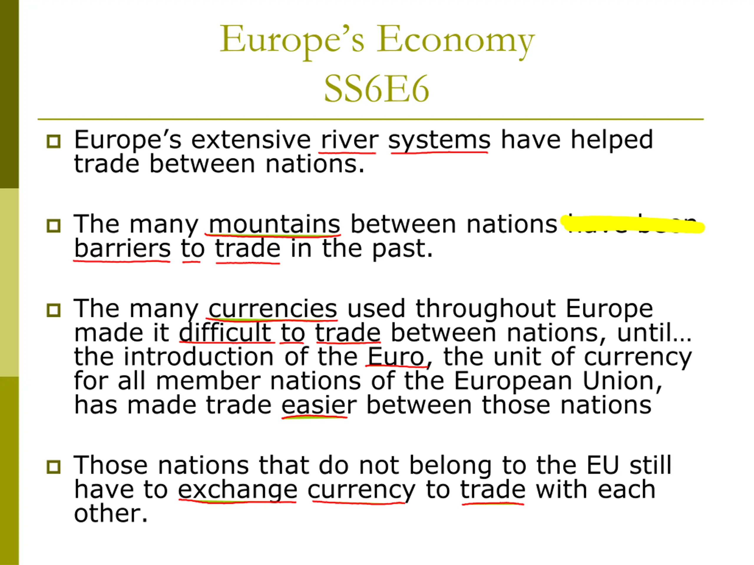 Europes Economy SS6E6 Europe s extensive river systems have helped trade between nations. The many mountains between nations have been barriers to trade in the past. The many currencies used throughout Europe made it difficult to trade between nations, until the introduction of the Euro, the unit of currency for all member nations of the European Union, has made trade easier between those nations Those nations that do not belong to the EU still have to exchange currency to trade with each other.