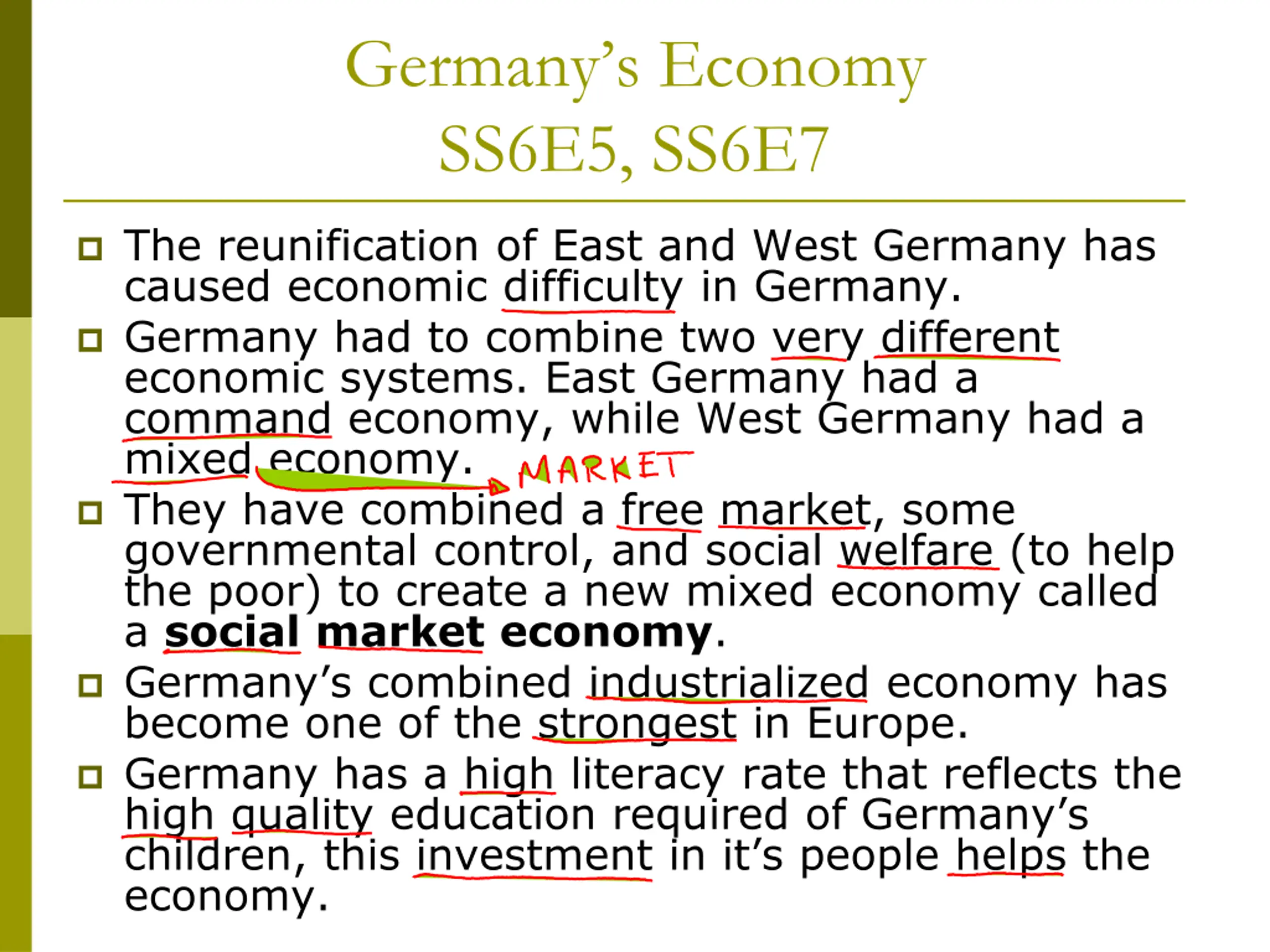Germanys Economy SS6E5, SS6E7 The reunification of East and West Germany has caused economic difficulty in Germany. Germany had to combine two very different economic systems. East Germany had a command economy, while West Germany had a mixed economy. They have combined a free market, some governmental control, and social welfare (to help the poor) to create a new mixed economy called a social market economy. Germany s combined industrialized economy has become one of the strongest in Europe. Germany has a high literacy rate that reflects the high quality education required of Germany s children, this investment in it s people helps the economy.