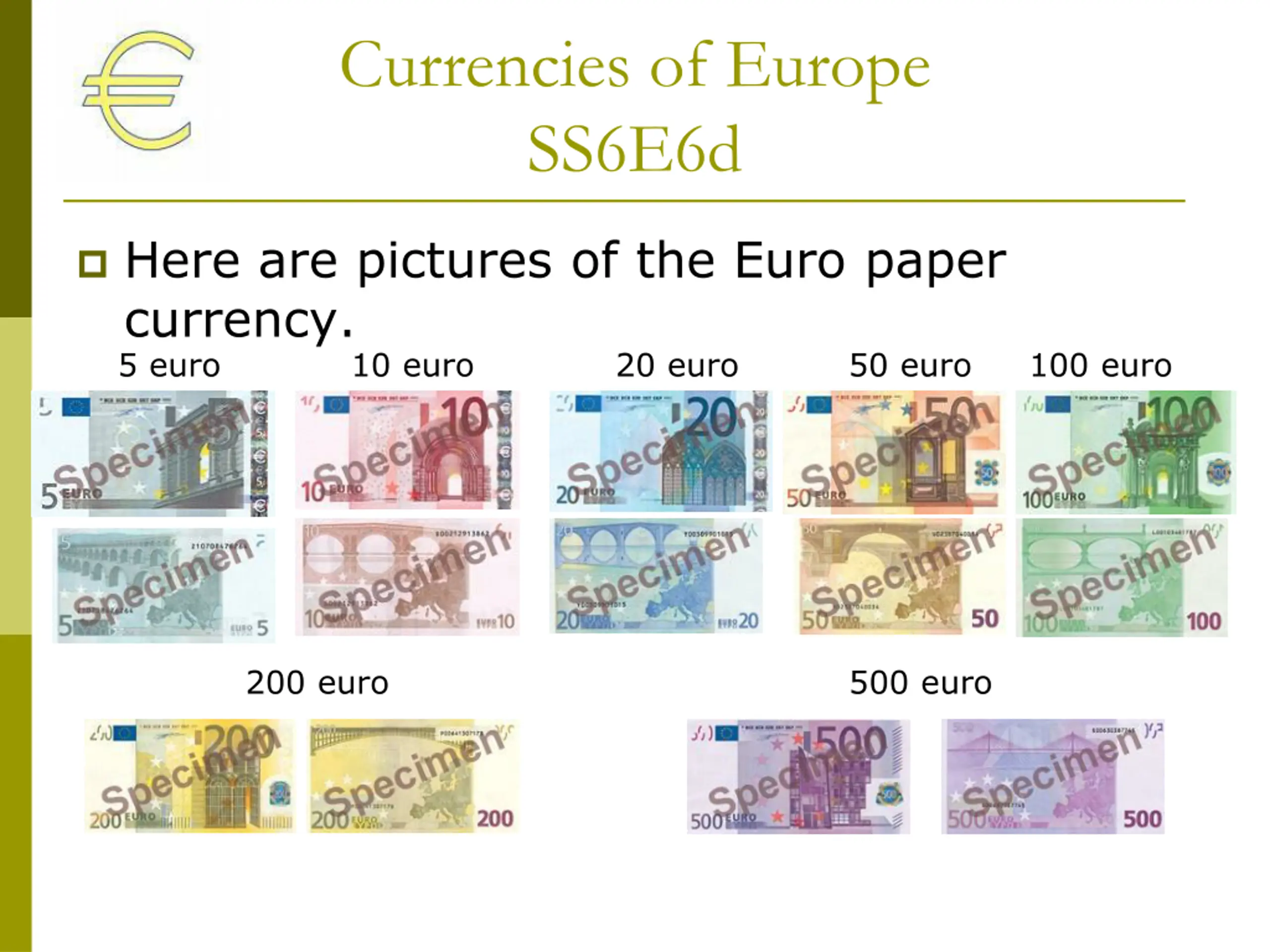 monetary_euro_symbol_01 Currencies of Europe SS6E6d Here are pictures of the Euro paper currency. 5 euro 10 euro 20 euro 50 euro 100 euro 200 euro 500 euro