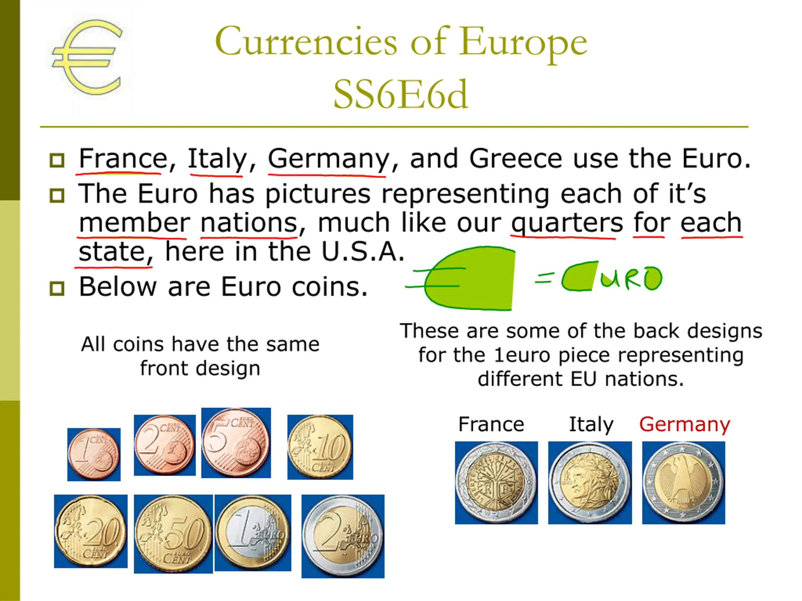 monetary_euro_symbol_01 Currencies of Europe SS6E6d France, Italy, Germany, and Greece use the Euro. The Euro has pictures representing each of it s member nations, much like our quarters for each state, here in the U.S.A. Below are Euro coins. These are some of the back designs for the 1euro piece representing different EU nations. All coins have the same front design 0.05 euro France Italy Germany 0.02 euro 0.1 euro 0.01 euro 0.2 euro 0.5 euro 1 euro 2 euro