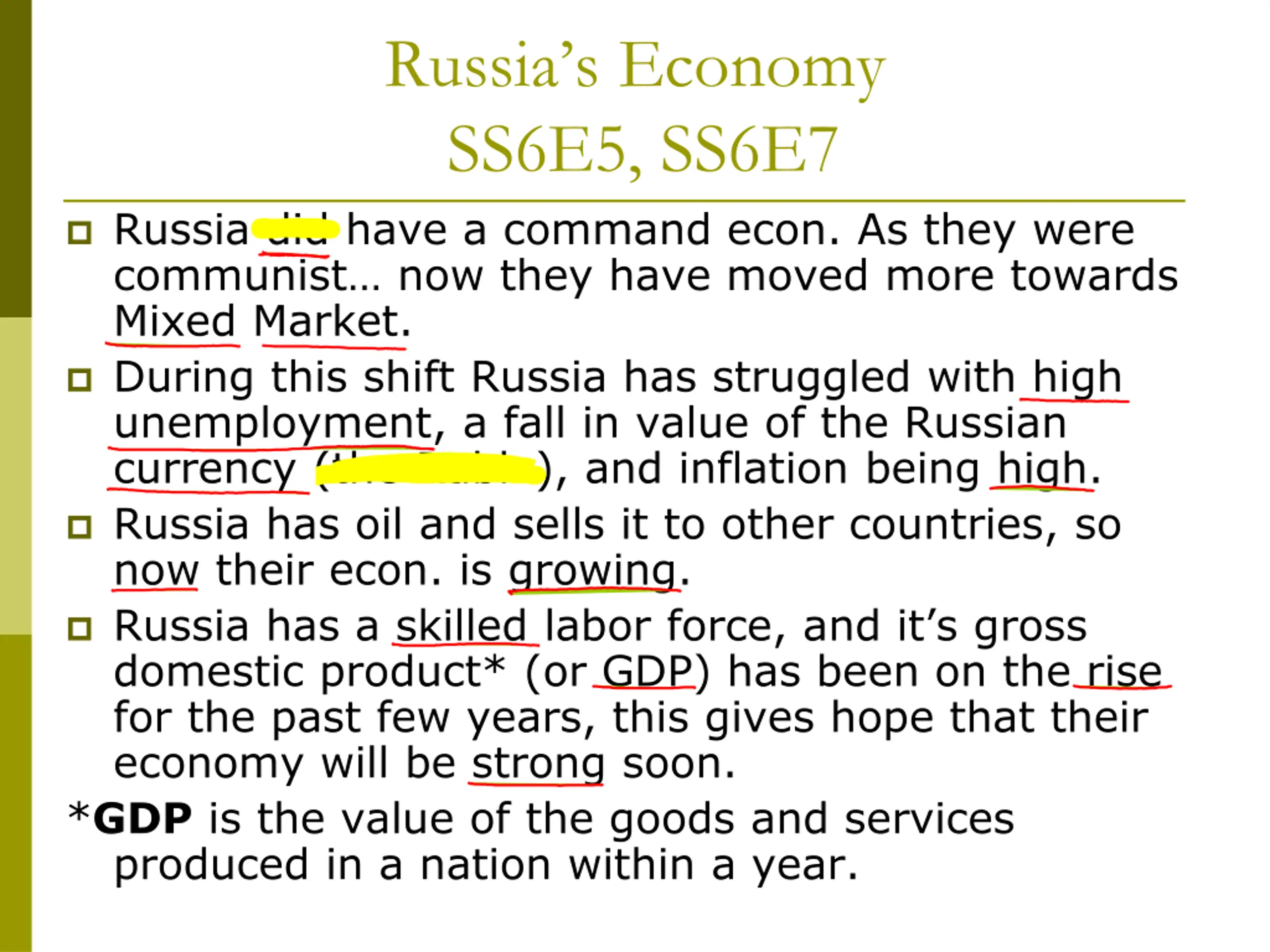 Russias Economy SS6E5, SS6E7 Russia did have a command econ. As they were communist now they have moved more towards Mixed Market. During this shift Russia has struggled with high unemployment, a fall in value of the Russian currency (the Ruble), and inflation being high. Russia has oil and sells it to other countries, so now their econ. is growing. Russia has a skilled labor force, and it s gross domestic product* (or GDP) has been on the rise for the past few years, this gives hope that their economy will be strong soon. *GDP is the value of the goods and services produced in a nation within a year.