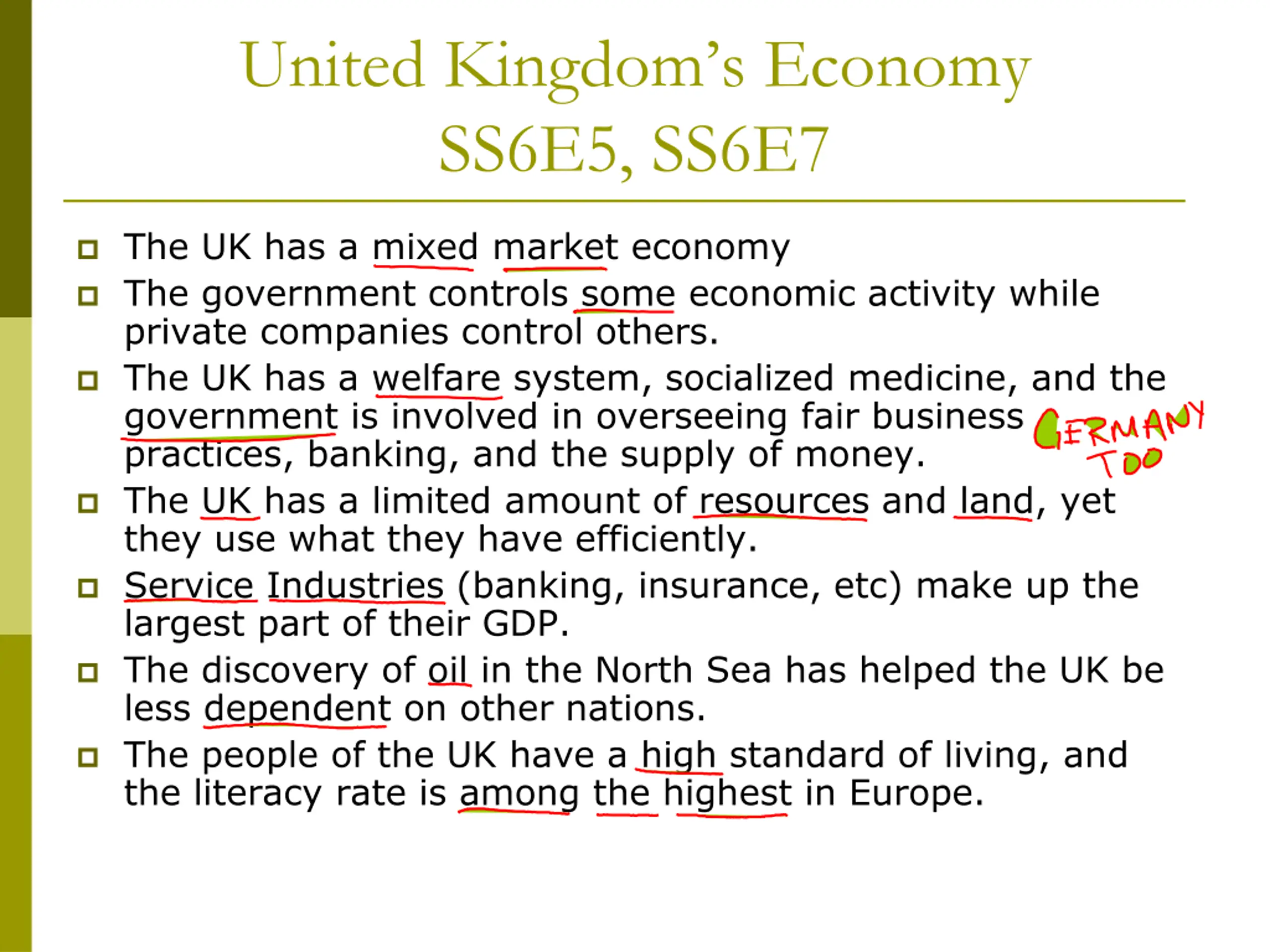 United Kingdoms Economy SS6E5, SS6E7 The UK has a mixed market economy The government controls some economic activity while private companies control others. The UK has a welfare system, socialized medicine, and the government is involved in overseeing fair business practices, banking, and the supply of money. The UK has a limited amount of resources and land, yet they use what they have efficiently. Service Industries (banking, insurance, etc) make up the largest part of their GDP. The discovery of oil in the North Sea has helped the UK be less dependent on other nations. The people of the UK have a high standard of living, and the literacy rate is among the highest in Europe.