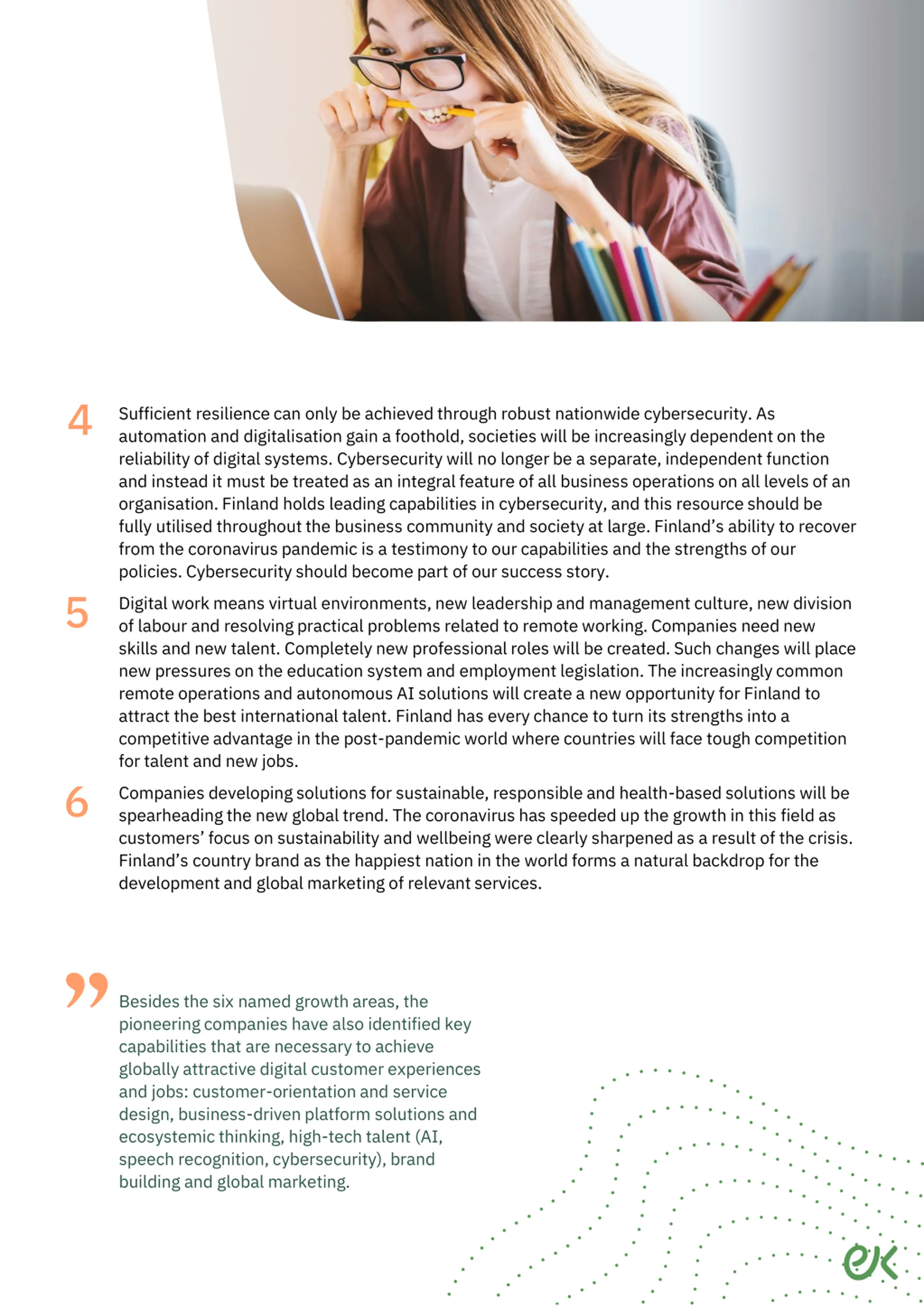 4 Sufficient resilience can only be achieved through robust nationwide cybersecurity. As automation and digitalisation gain a foothold, societies will be increasingly dependent on the reliability of digital systems. Cybersecurity will no longer be a separate, independent function and instead it must be treated as an integral feature of all business operations on all levels of an organisation. Finland holds leading capabilities in cybersecurity, and this resource should be fully utilised throughout the business community and society at large. Finland s ability to recover from the coronavirus pandemic is a testimony to our capabilities and the strengths of our policies. Cybersecurity should become part of our success story. 5 Digital work means virtual environments, new leadership and management culture, new division of labour and resolving practical problems related to remote working. Companies need new skills and new talent. Completely new professional roles will be created. Such changes will place new pressures on the education system and employment legislation. The increasingly common remote operations and autonomous AI solutions will create a new opportunity for Finland to attract the best international talent. Finland has every chance to turn its strengths into a competitive advantage in the post-pandemic world where countries will face tough competition for talent and new jobs. 6 Companies developing solutions for sustainable, responsible and health-based solutions will be spearheading the new global trend. The coronavirus has speeded up the growth in this field as customers focus on sustainability and wellbeing were clearly sharpened as a result of the crisis. Finland s country brand as the happiest nation in the world forms a natural backdrop for the development and global marketing of relevant services. Besides the six named growth areas, the pioneering companies have also identified key capabilities that are necessary to achieve globally attractive digital customer experiences and jobs: customer-orientation and service design, business-driven platform solutions and ecosystemicthinking, high-tech talent (AI, speech recognition, cybersecurity), brand building and global marketing.