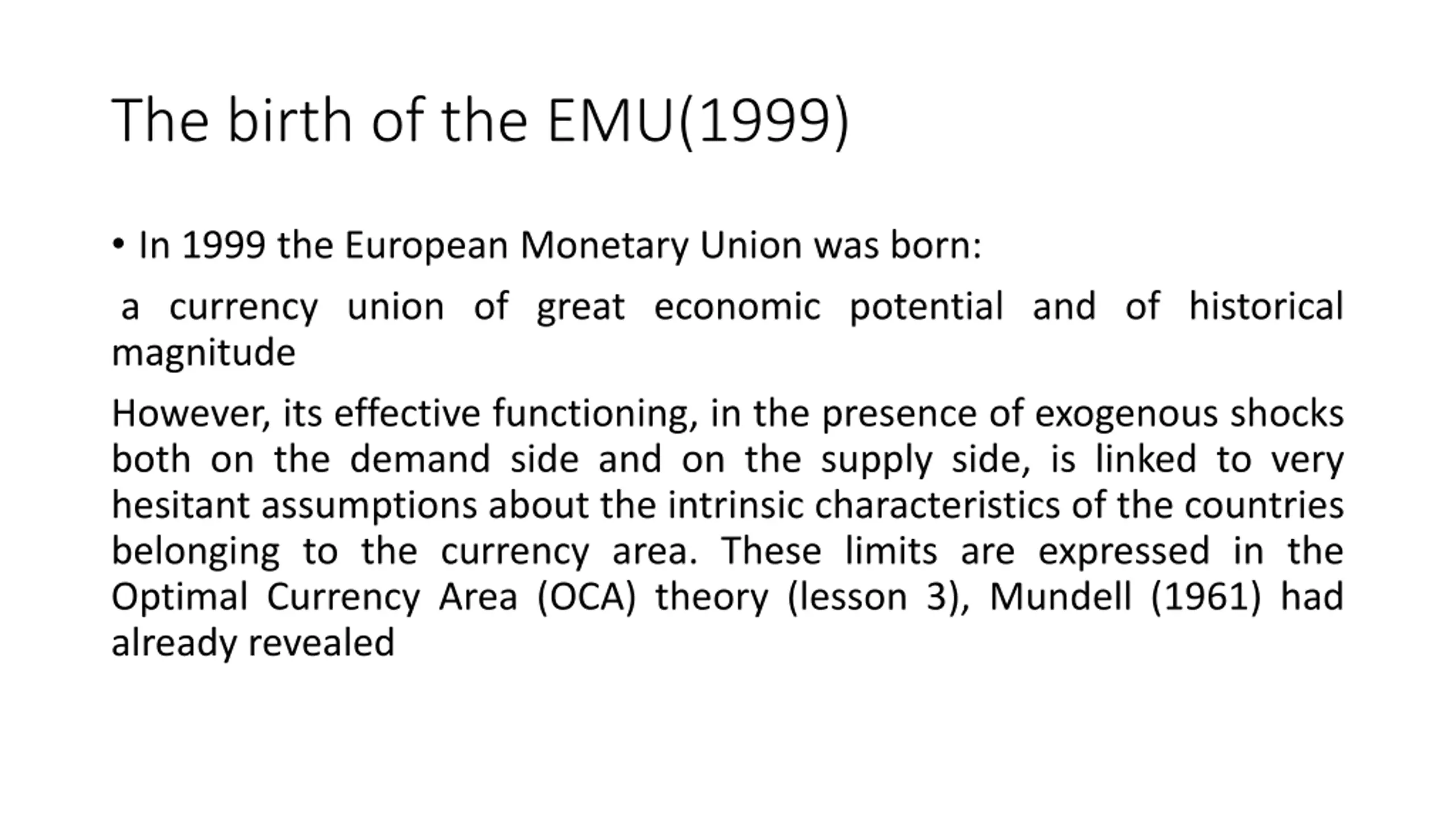 The birth of the EMU(1999) In 1999 the European Monetary Union was born: a currency union of great economic potential and of historical magnitude However, its effective functioning, in the presence of exogenous shocks both on the demand side and on the supply side, is linked to very hesitant assumptions about the intrinsic characteristics of the countries belonging to the currency area. These limits are expressed in the Optimal Currency Area (OCA) theory (lesson 3), Mundell (1961) had already revealed