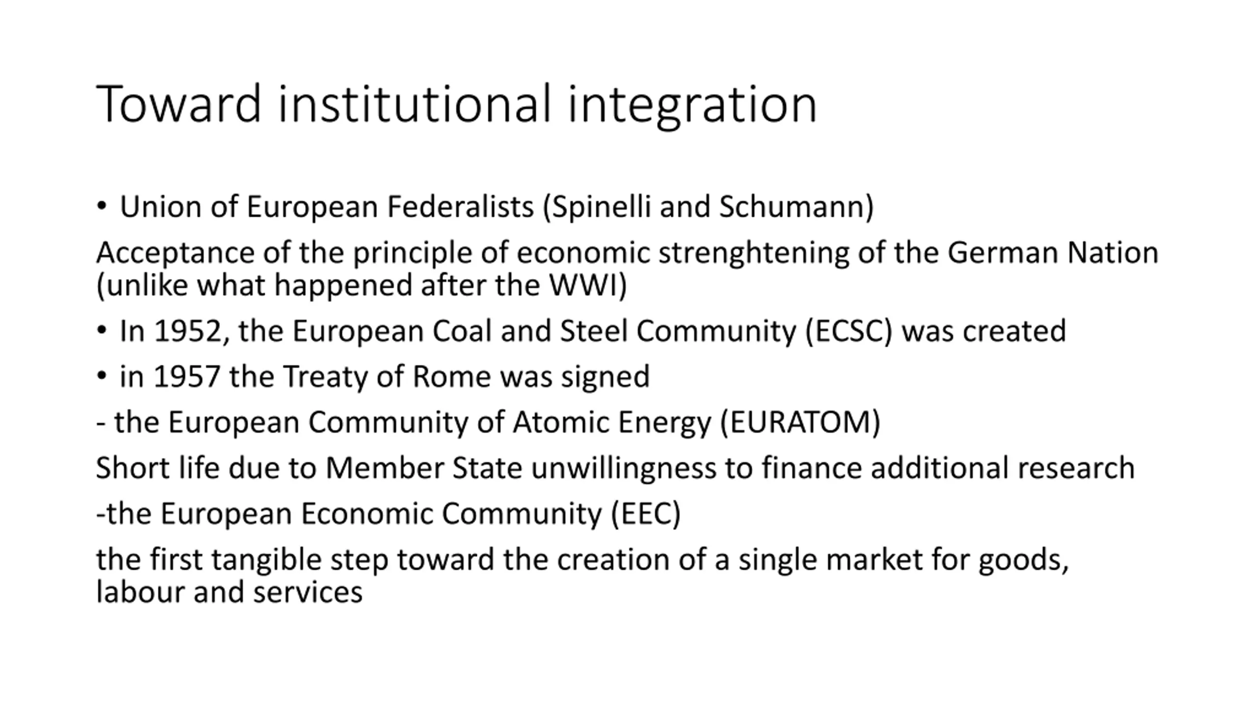 Toward institutional integration Union of European Federalists (Spinelli and Schumann) Acceptance of the principle of economic strenghtening of the German Nation (unlike what happened after the WWI) In 1952, the European Coal and Steel Community (ECSC) was created in 1957 the Treaty of Rome was signed - the European Community of Atomic Energy (EURATOM) Short life due to Member State unwillingness to finance additional research -the European Economic Community (EEC) the first tangible step toward the creation of a single market for goods, labour and services