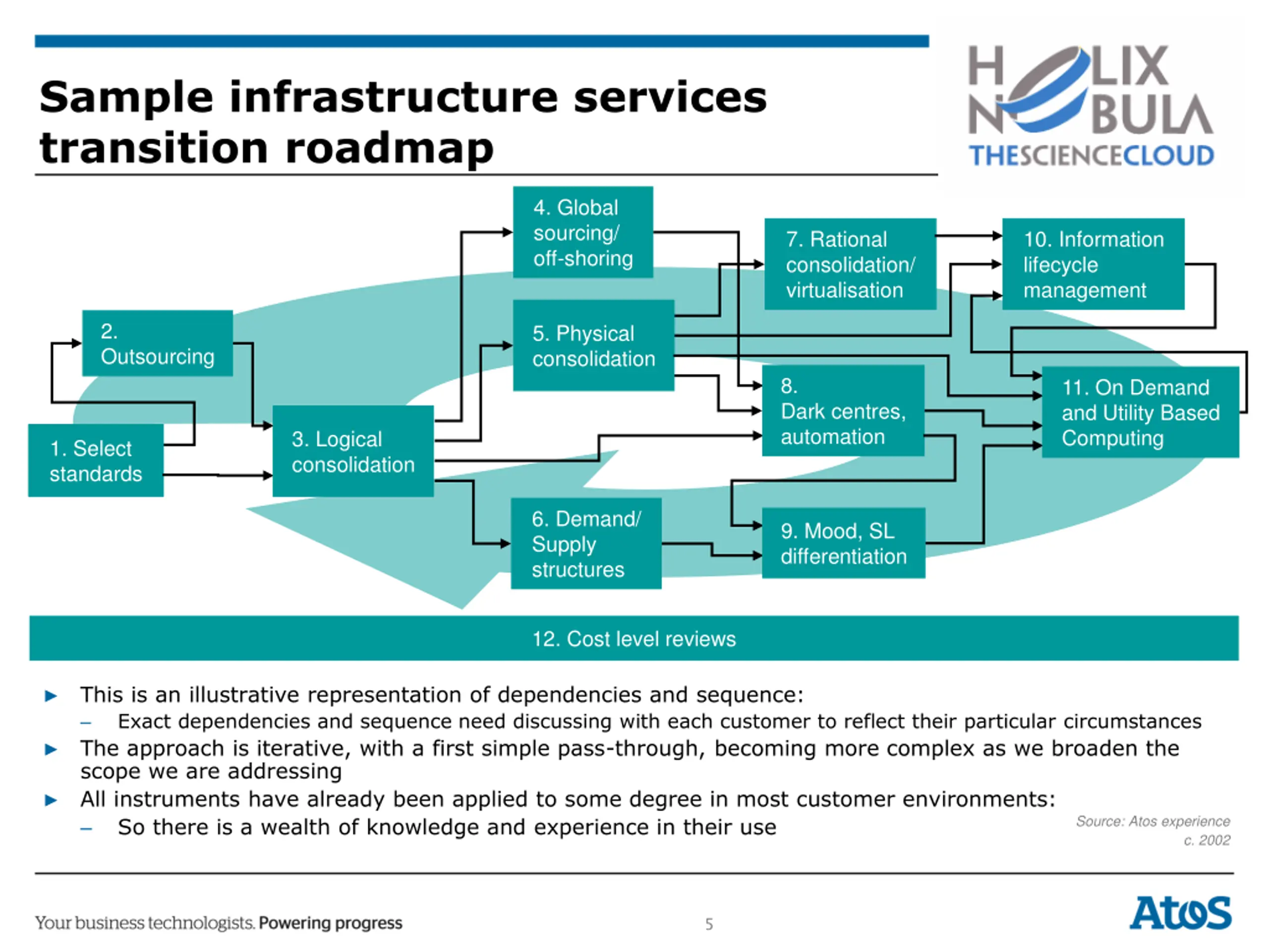 04/04/2025 Mick Symonds Confidential Sample infrastructure services transition roadmap 4. Global sourcing/ off-shoring 7. Rational consolidation/ virtualisation 10. Information lifecycle management 2. Outsourcing 5. Physical consolidation 8. Dark centres, automation 11. On Demand and Utility Based Computing 3. Logical consolidation 1. Select standards 6. Demand/ Supply structures 9. Mood, SL differentiation 12. Cost level reviews This is an illustrative representation of dependencies and sequence: Exact dependencies and sequence need discussing with each customer to reflect their particular circumstances The approach is iterative, with a first simple pass-through, becoming more complex as we broaden the scope we are addressing All instruments have already been applied to some degree in most customer environments: So there is a wealth of knowledge and experience in their use Source: Atos experience c. 2002 5