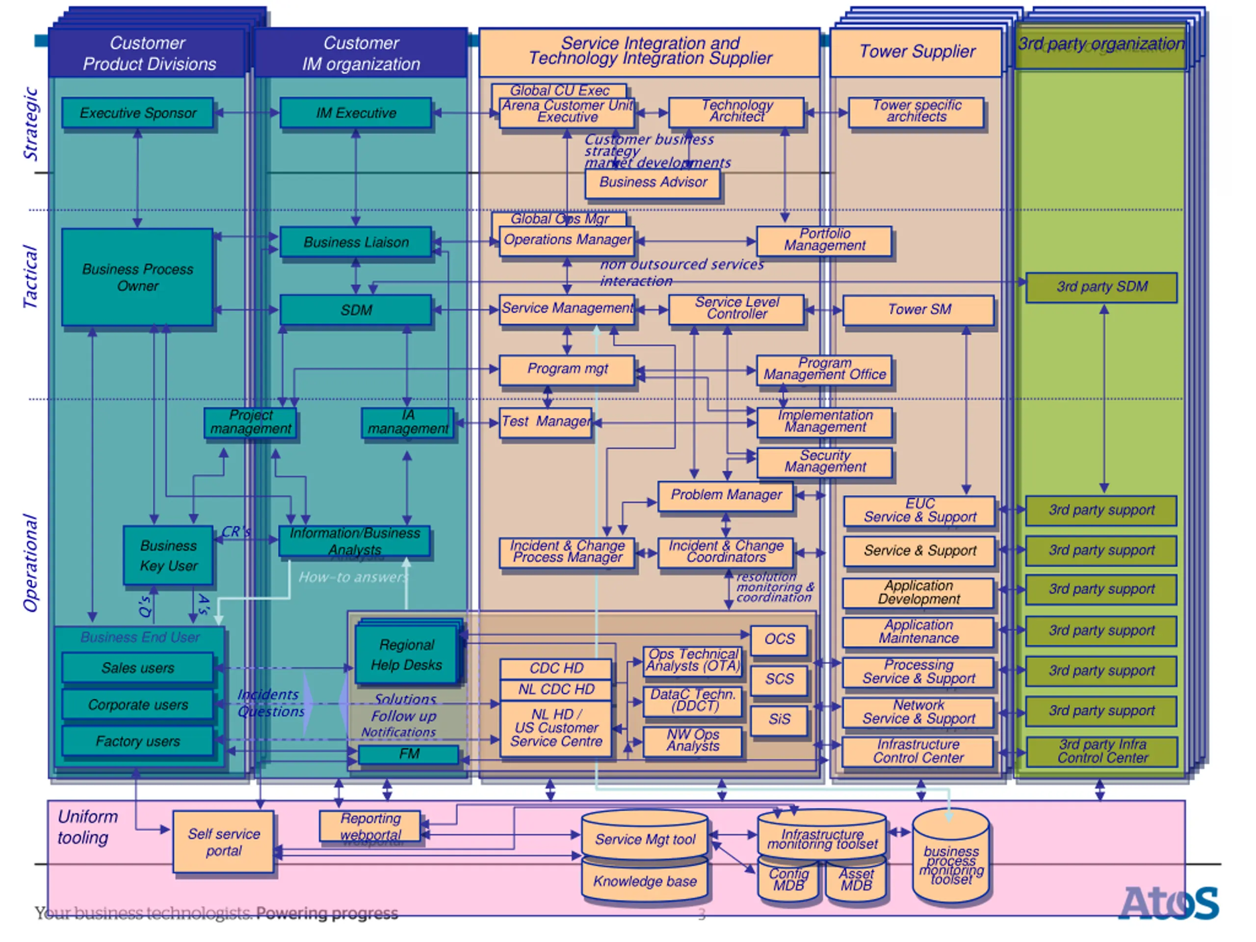Customer Demand Customer businesses Arena s Arena s Arena s Arena s Product Divisions Tower Supply Org Tower organization Tower organization Tower organization Tower organization Tower Supplier Tower Supply Org Tower organization Tower organization Tower organization Tower organization 3rd party organization Customer Demand Customer businesses Customer Demand Customer businesses Customer Demand Customer businesses Customer Demand Customer Tower Supply Org Tower Supply Org Tower Supply Org Tower Supply Org Tower Supply Org Tower Supply Org Tower Supply Org Customer Supply Organization Customer IM organization SiTi Supply Organization Service Integration and Technology Integration Supplier 04/04/2025 Mick Symonds Confidential Global CU Exec Arena Customer Unit Executive Strategic Technology Architect Tower specific architects Executive Sponsor IM Executive Customer business strategy market developments Business Advisor Global Ops Mgr Operations Manager Portfolio Management Business Liaison Tactical non outsourced services interaction Business Process Owner 3rd party SDM Service Level Controller Service Management Tower SM SDM Program Program mgt Management Office Implementation Management Project management IA Test Manager management Security Management Problem Manager EUC 3rd party support Service & Support Operational CR s Information/Business Analysts Incident & Change Process Manager Incident & Change Coordinators Business Key User 3rd party support Service & Support How-to answers resolution monitoring & coordination Application Development 3rd party support A s Q s Application Maintenance 3rd party support Business End User OpCo Retail Help Desk Help Desk Help Desks OCS OpCo Retail Regional Ops Technical Analysts (OTA) Processing Service & Support Sales users CDC HD NL CDC HD 3rd party support SCS Incidents Questions DataC Techn. (DDCT) Solutions Follow up Notifications FM Corporate users Network 3rd party support NL HD / US Customer Service Centre Service & Support SiS NW Ops Analysts Factory users Infrastructure Control Center 3rd party Infra Control Center Uniform tooling Reporting webportal Self service portal Infrastructure monitoring toolset Service Mgt tool business process monitoring toolset Config MDB Asset MDB Knowledge base 3