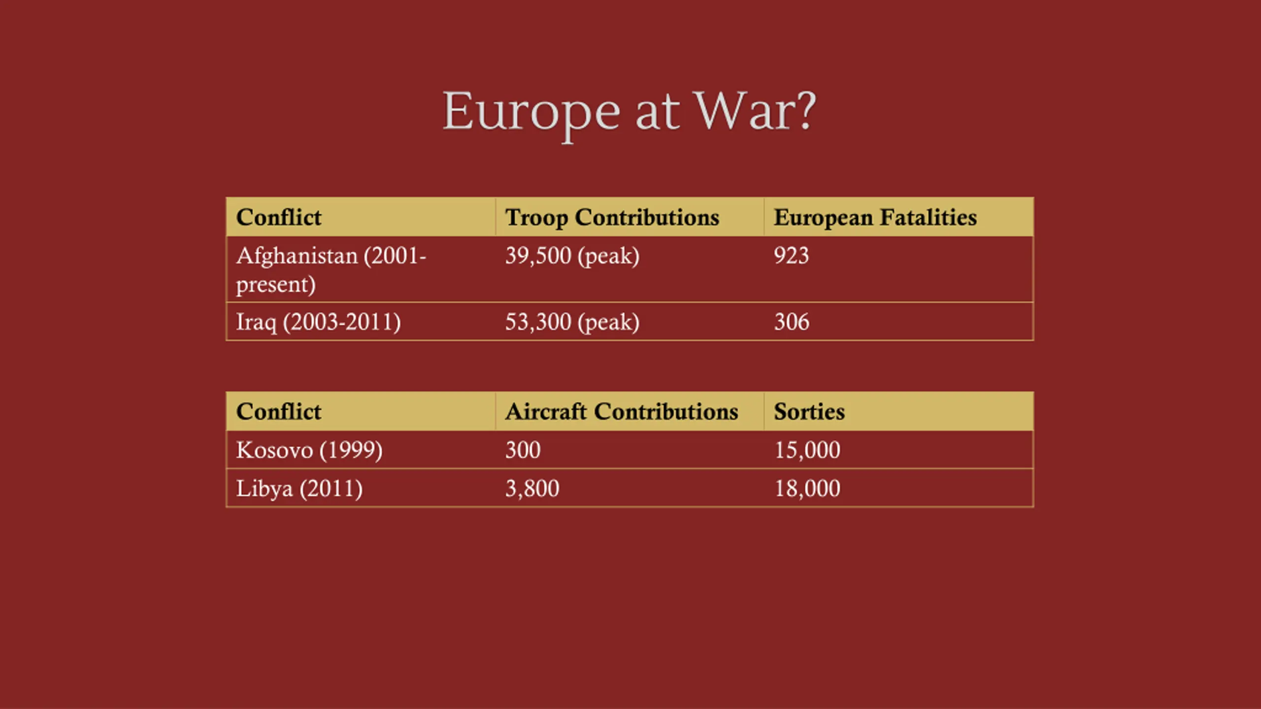 Europe at War? Conflict Afghanistan (2001- present) Iraq (2003-2011) Troop Contributions 39,500 (peak) European Fatalities 923 53,300 (peak) 306 Conflict Kosovo (1999) Libya (2011) Aircraft Contributions 300 3,800 Sorties 15,000 18,000