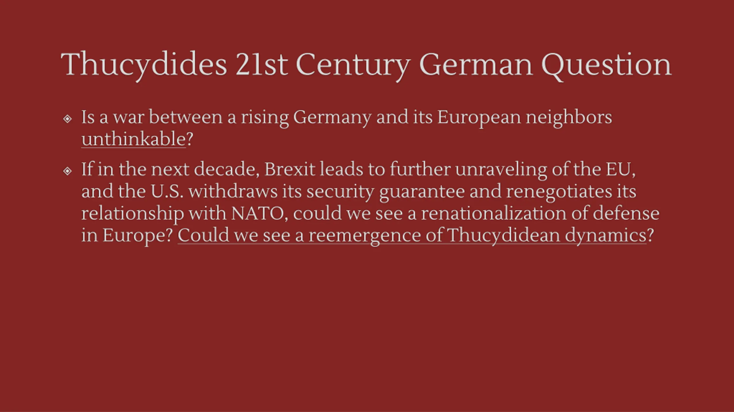 Thucydides 21st Century German Question Is a war between a rising Germany and its European neighbors unthinkable? If in the next decade, Brexit leads to further unraveling of the EU, and the U.S. withdraws its security guarantee and renegotiates its relationship with NATO, could we see a renationalization of defense in Europe? Could we see a reemergence of Thucydidean dynamics?