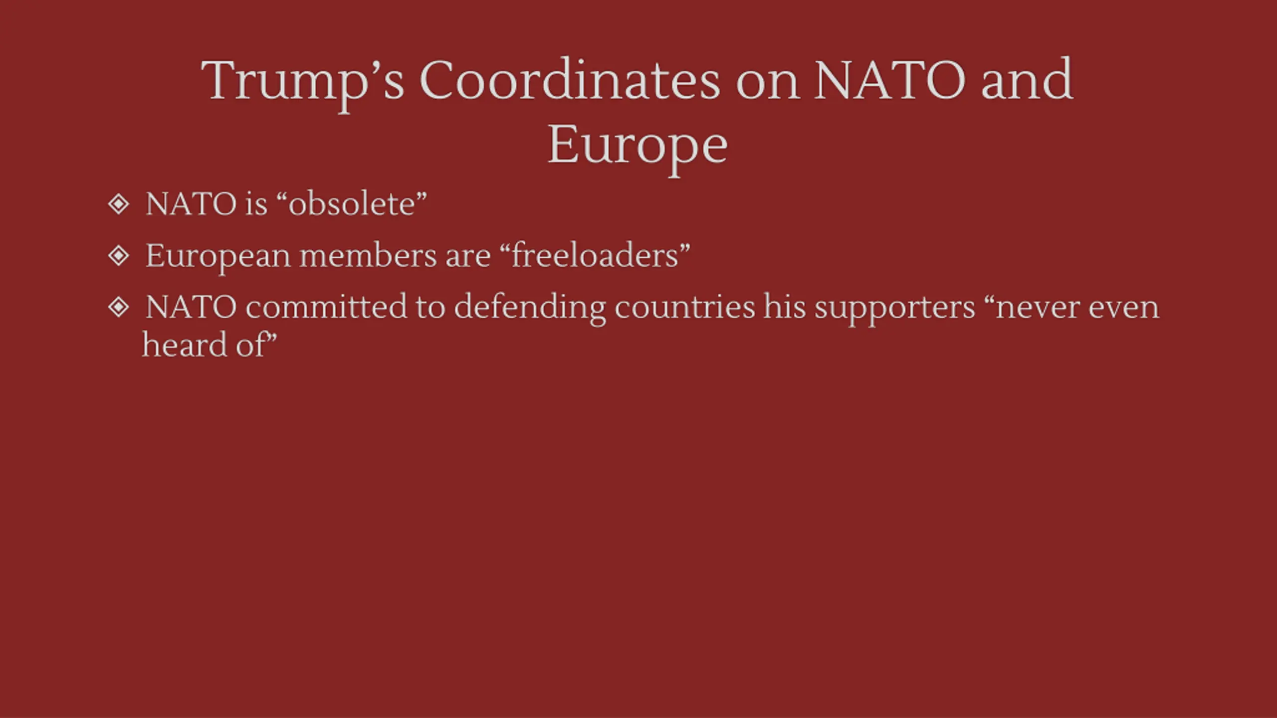 Trumps Coordinates on NATO and Europe NATO is obsolete European members are freeloaders NATO committed to defending countries his supporters never even heard of
