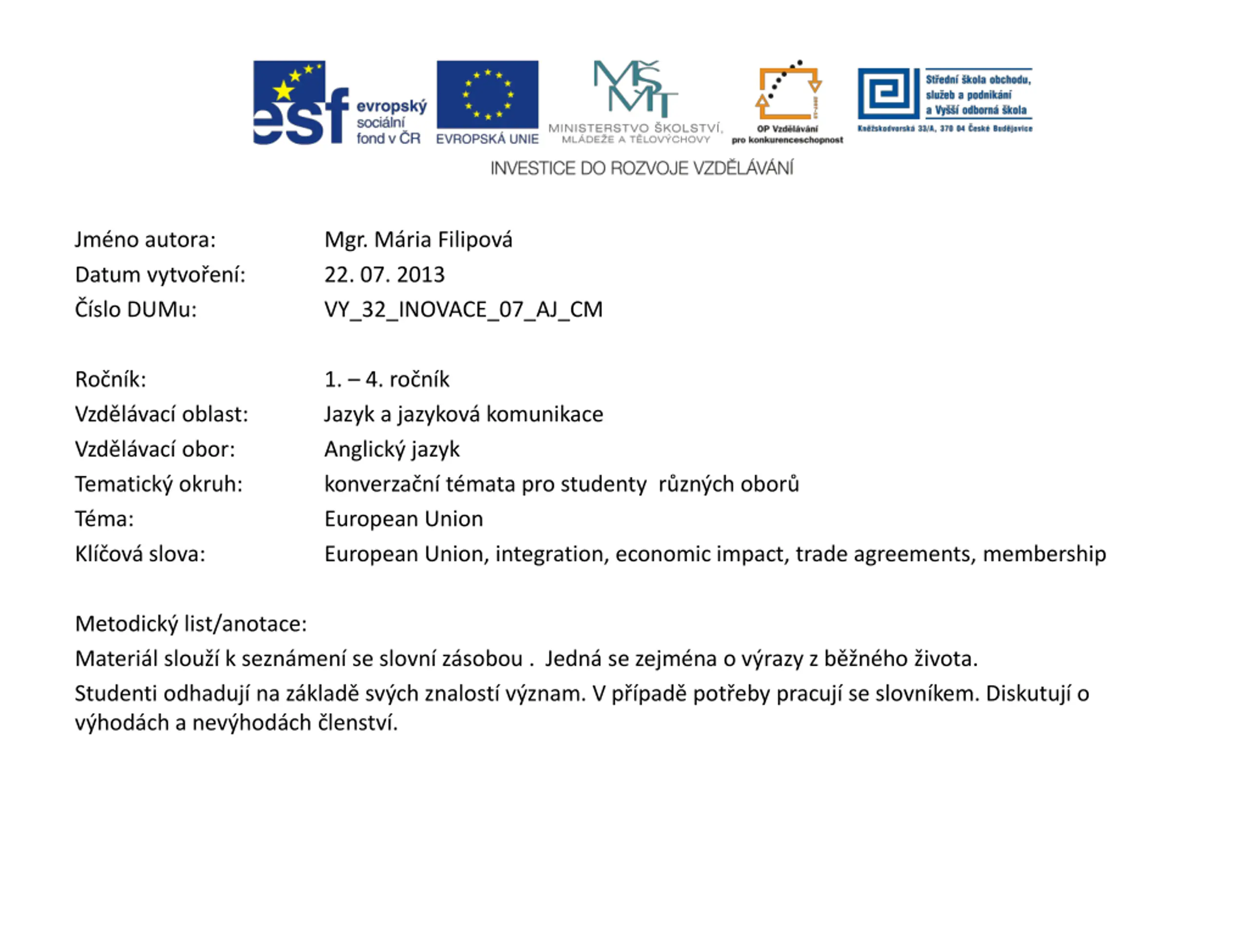 Jmno autora: Datum vytvo en : slo DUMu: Mgr. M ria Filipov 22. 07. 2013 VY_32_INOVACE_07_AJ_CM Ro n k: Vzd l vac oblast: Vzd l vac obor: Tematick okruh: T ma: Kl ov slova: 1. 4. ro n k Jazyk a jazykov komunikace Anglick jazyk konverza n t mata pro studenty r zn ch obor European Union European Union, integration, economic impact, trade agreements, membership Metodick list/anotace: Materi l slou k sezn men se slovn z sobou . Jedn se zejm na o v razy z b n ho ivota. Studenti odhaduj na z klad sv ch znalost v znam. V p pad pot eby pracuj se slovn kem. Diskutuj o v hod ch a nev hod ch lenstv .