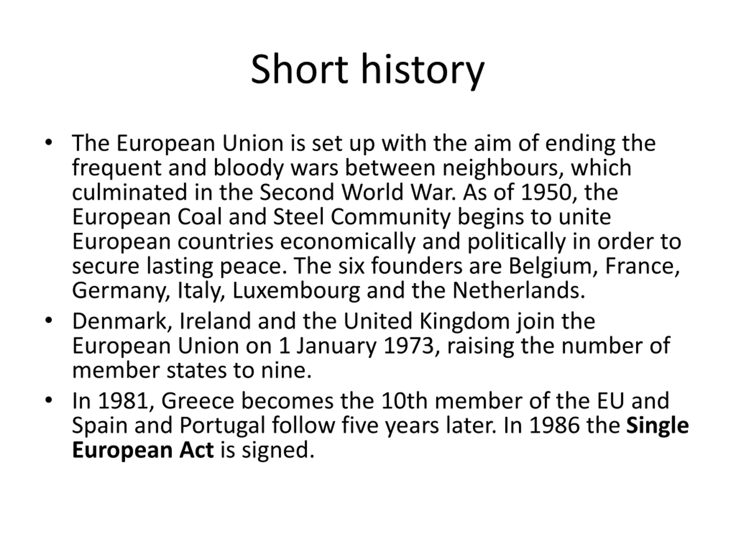 Short history The European Union is set up with the aim of ending the frequent and bloody wars between neighbours, which culminated in the Second World War. As of 1950, the European Coal and Steel Community begins to unite European countries economically and politically in order to secure lasting peace. The six founders are Belgium, France, Germany, Italy, Luxembourg and the Netherlands. Denmark, Ireland and the United Kingdom join the European Union on 1 January 1973, raising the number of member states to nine. In 1981, Greece becomes the 10th member of the EU and Spain and Portugal follow five years later. In 1986 the Single European Act is signed.