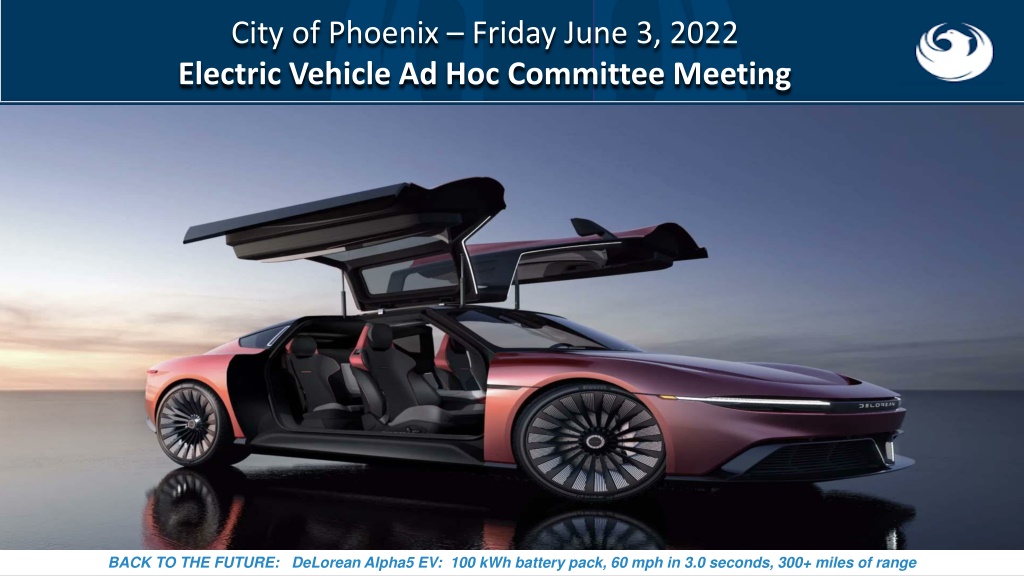 City of Phoenix Friday June 3, 2022 Electric Vehicle Ad Hoc Committee Meeting BACK TO THE FUTURE: DeLorean Alpha5 EV: 100 kWh battery pack, 60 mph in 3.0 seconds, 300+ miles of range