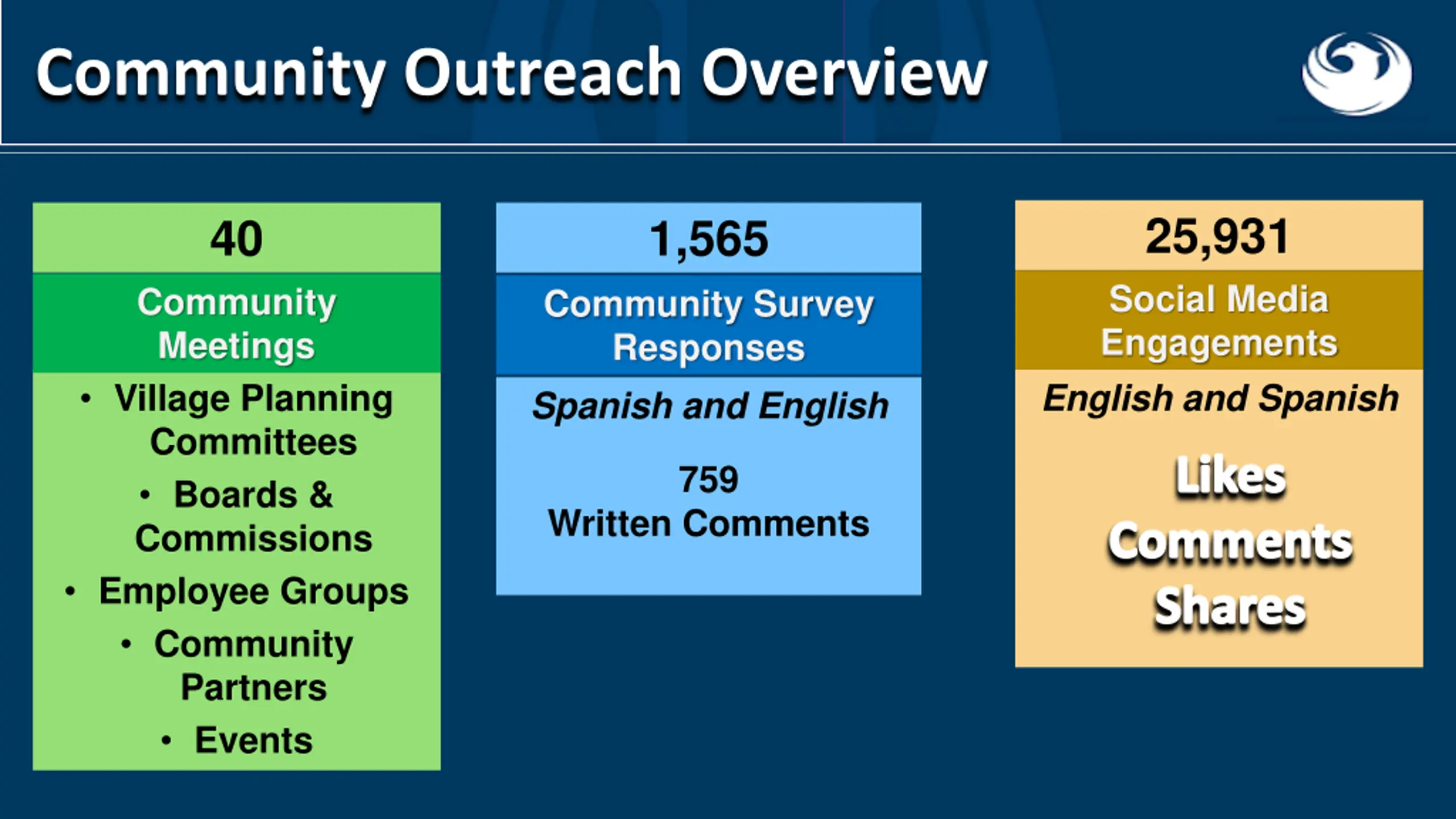 Community Outreach Overview 25,931 40 1,565 Social Media Engagements English and Spanish Community Meetings Community Survey Responses Village Planning Committees Boards & Commissions Employee Groups Community Partners Events Spanish and English Likes 759 Written Comments Comments Shares