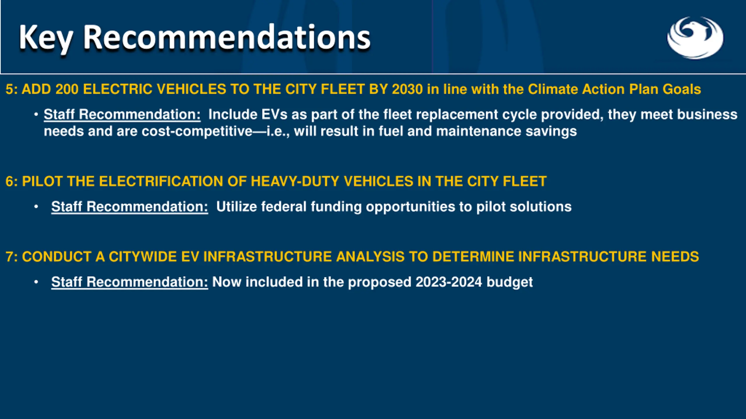 Key Recommendations 5: ADD 200 ELECTRIC VEHICLES TO THE CITY FLEET BY 2030 in line with the Climate Action Plan Goals Staff Recommendation: Include EVs as part of the fleet replacement cycle provided, they meet business needs and are cost-competitive i.e., will result in fuel and maintenance savings 6: PILOT THE ELECTRIFICATION OF HEAVY-DUTY VEHICLES IN THE CITY FLEET Staff Recommendation: Utilize federal funding opportunities to pilot solutions 7: CONDUCT A CITYWIDE EV INFRASTRUCTURE ANALYSIS TO DETERMINE INFRASTRUCTURE NEEDS Staff Recommendation: Now included in the proposed 2023-2024 budget