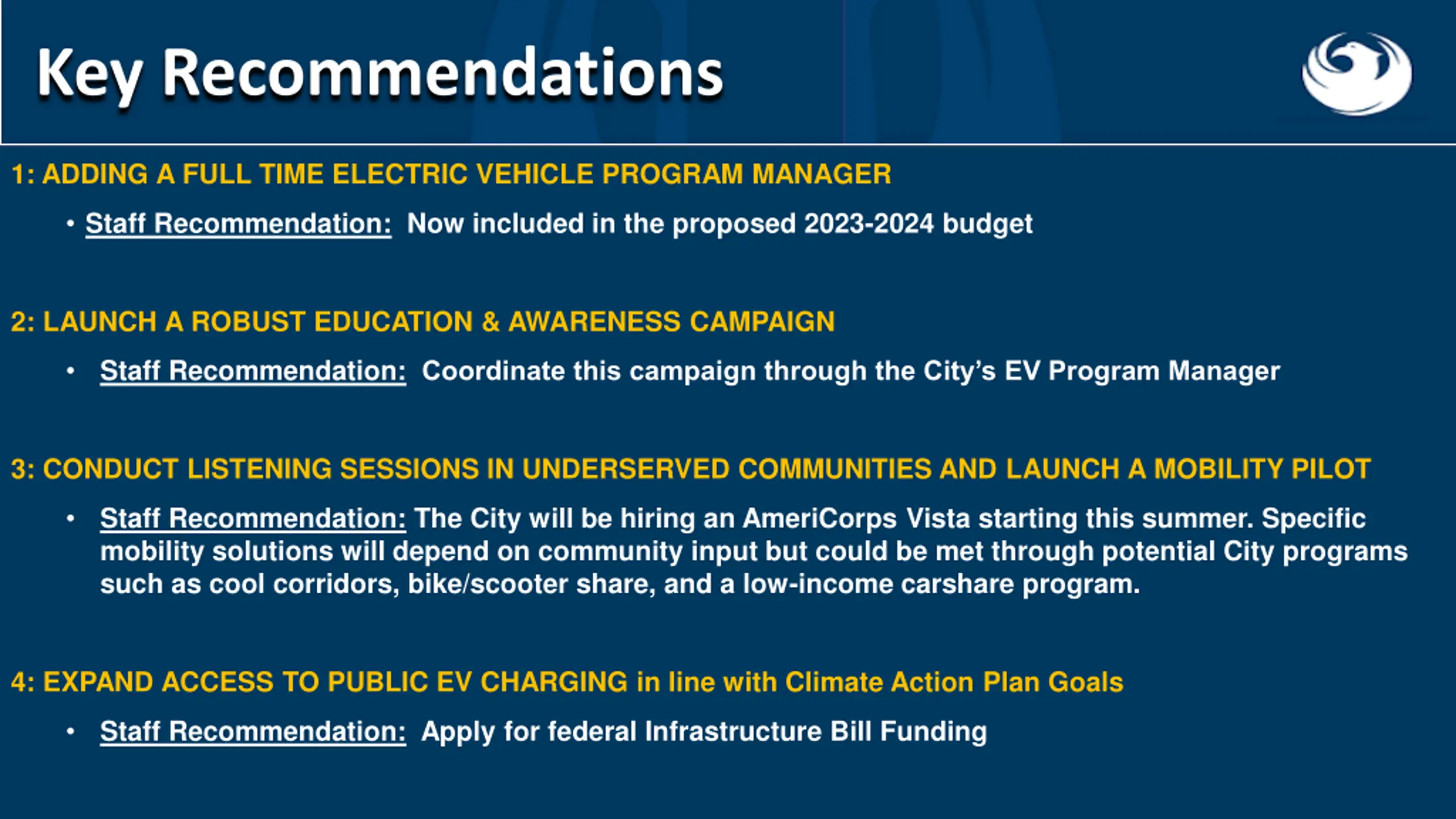 Key Recommendations 1: ADDING A FULL TIME ELECTRIC VEHICLE PROGRAM MANAGER Staff Recommendation: Now included in the proposed 2023-2024 budget 2: LAUNCH A ROBUST EDUCATION & AWARENESS CAMPAIGN Staff Recommendation: Coordinate this campaign through the City s EV Program Manager 3: CONDUCT LISTENING SESSIONS IN UNDERSERVED COMMUNITIES AND LAUNCH A MOBILITY PILOT Staff Recommendation: The City will be hiring an AmeriCorps Vista starting this summer. Specific mobility solutions will depend on community input but could be met through potential City programs such as cool corridors, bike/scooter share, and a low-income carshare program. 4: EXPAND ACCESS TO PUBLIC EV CHARGING in line with Climate Action Plan Goals Staff Recommendation: Apply for federal Infrastructure Bill Funding