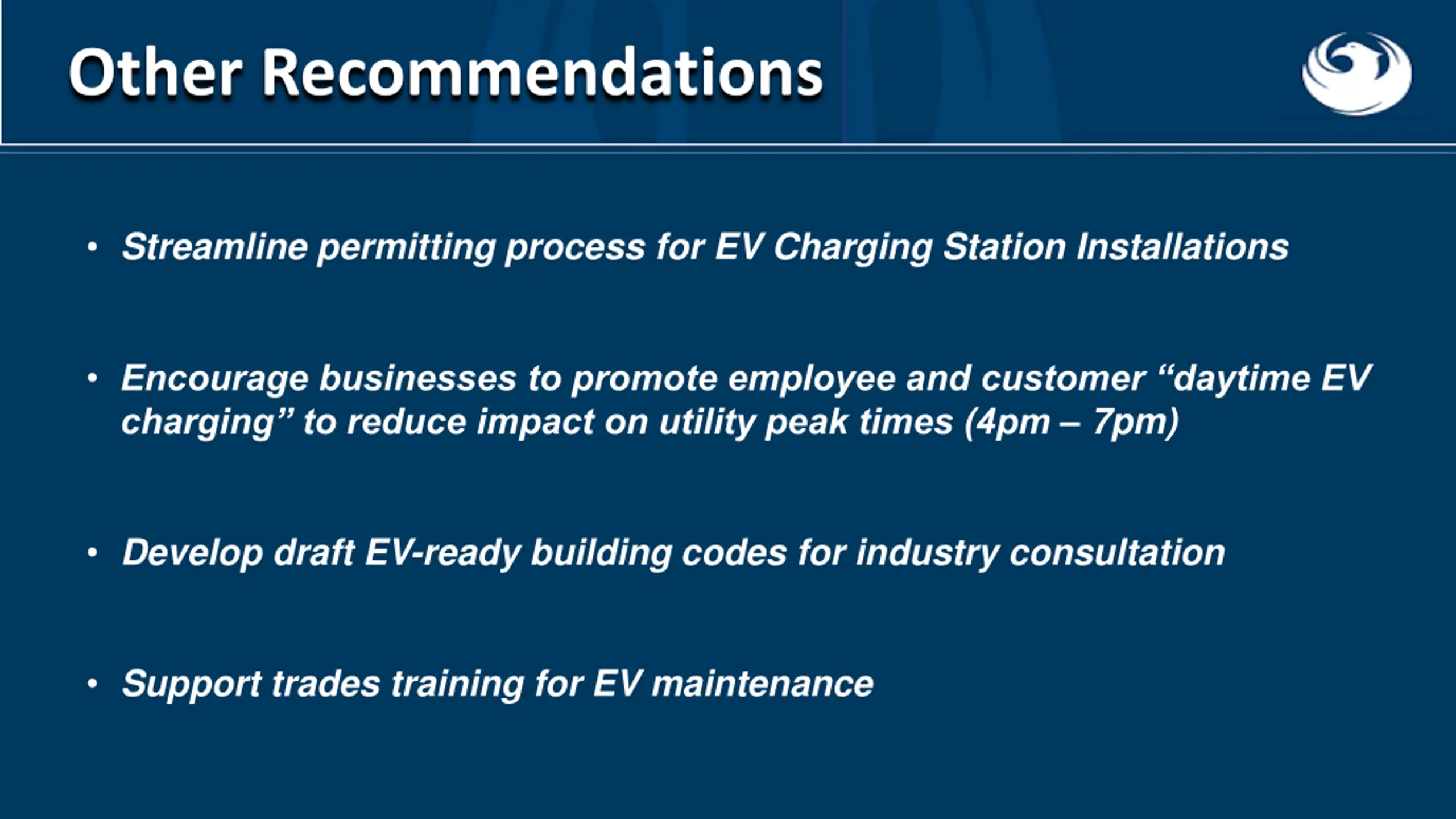 Other Recommendations Streamline permitting process for EV Charging Station Installations Encourage businesses to promote employee and customer daytime EV charging to reduce impact on utility peak times (4pm 7pm) Develop draft EV-ready building codes for industry consultation Support trades training for EV maintenance