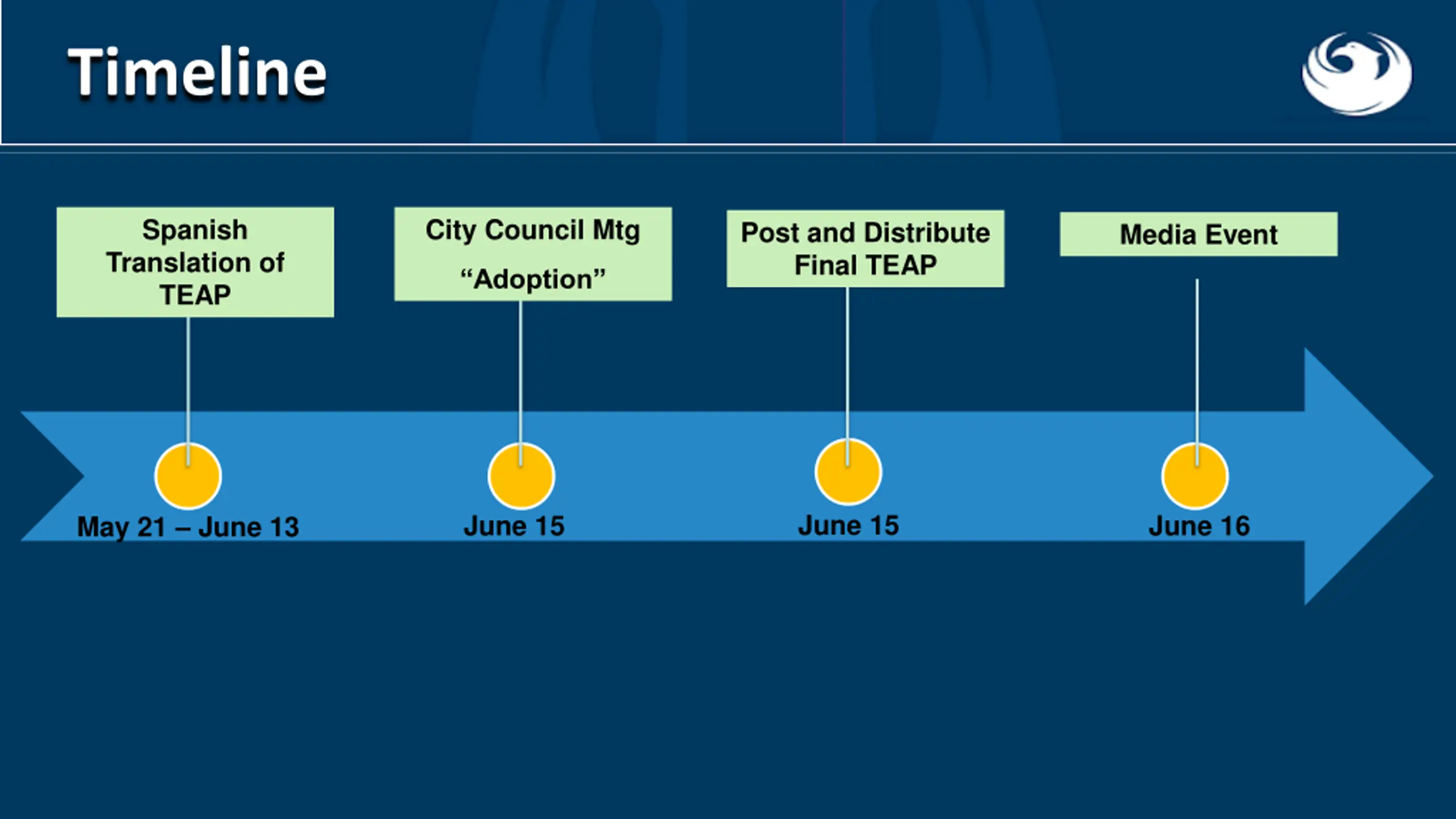 Timeline Spanish Translation of TEAP City Council Mtg Post and Distribute Final TEAP Media Event Adoption June 15 June 15 June 16 May 21 June 13