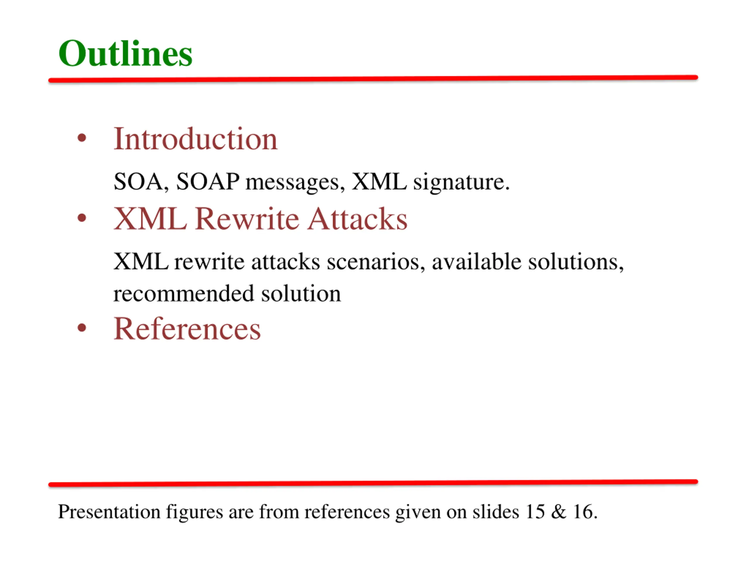 Outlines Introduction SOA, SOAP messages, XML signature. XML Rewrite Attacks XML rewrite attacks scenarios, available solutions, recommended solution References Presentation figures are from references given on slides 15 & 16.