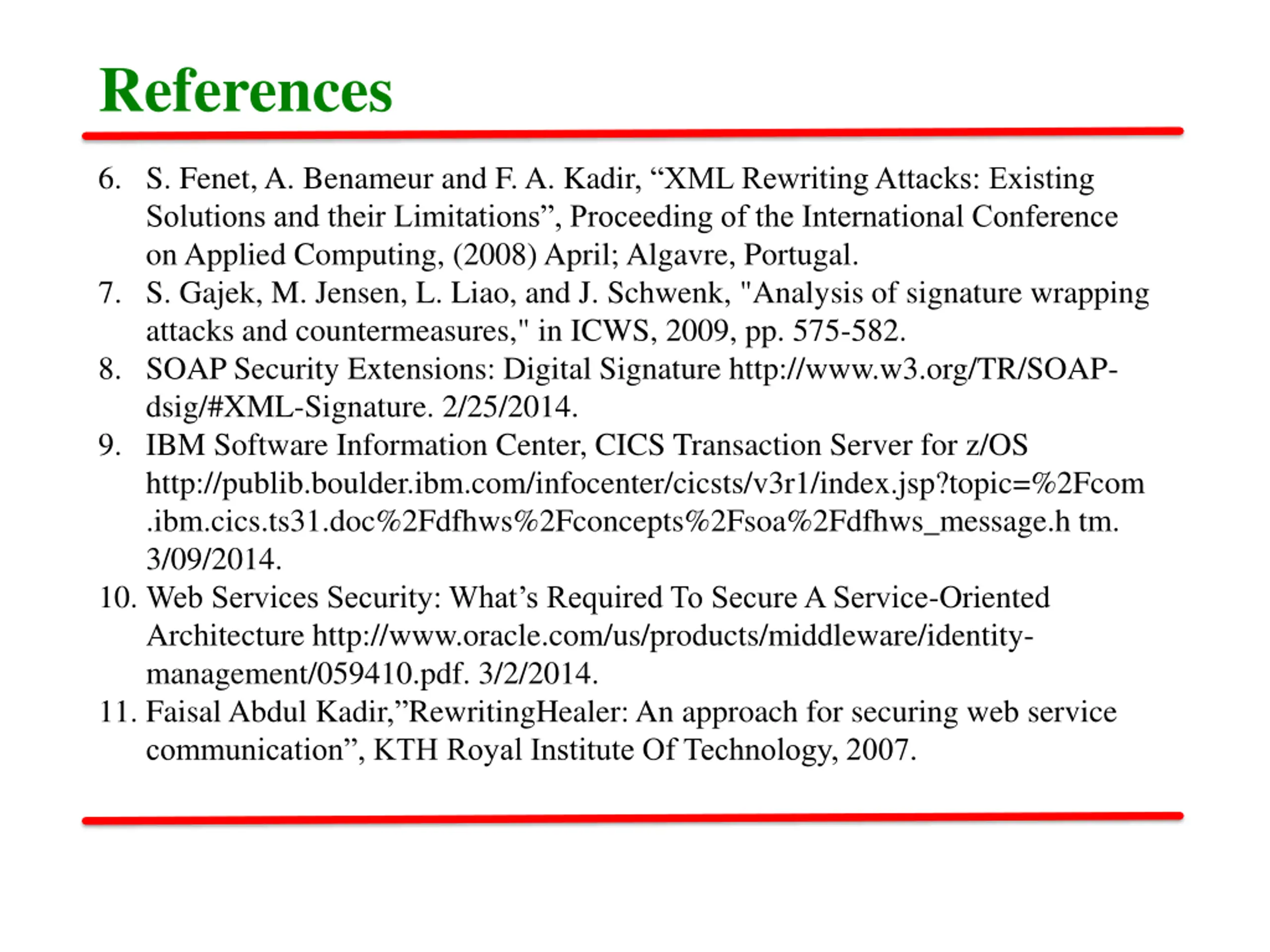 References 6. S. Fenet, A. Benameur and F. A. Kadir, XML Rewriting Attacks: Existing Solutions and their Limitations , Proceeding of the International Conference on Applied Computing, (2008) April; Algavre, Portugal. 7. S. Gajek, M. Jensen, L. Liao, and J. Schwenk, "Analysis of signature wrapping attacks and countermeasures," in ICWS, 2009, pp. 575-582. 8. SOAP Security Extensions: Digital Signature http://www.w3.org/TR/SOAP- dsig/#XML-Signature. 2/25/2014. 9. IBM Software Information Center, CICS Transaction Server for z/OS http://publib.boulder.ibm.com/infocenter/cicsts/v3r1/index.jsp?topic=%2Fcom .ibm.cics.ts31.doc%2Fdfhws%2Fconcepts%2Fsoa%2Fdfhws_message.h tm. 3/09/2014. 10. Web Services Security: What s Required To Secure A Service-Oriented Architecture http://www.oracle.com/us/products/middleware/identity- management/059410.pdf. 3/2/2014. 11. Faisal Abdul Kadir, RewritingHealer: An approach for securing web service communication , KTH Royal Institute Of Technology, 2007.