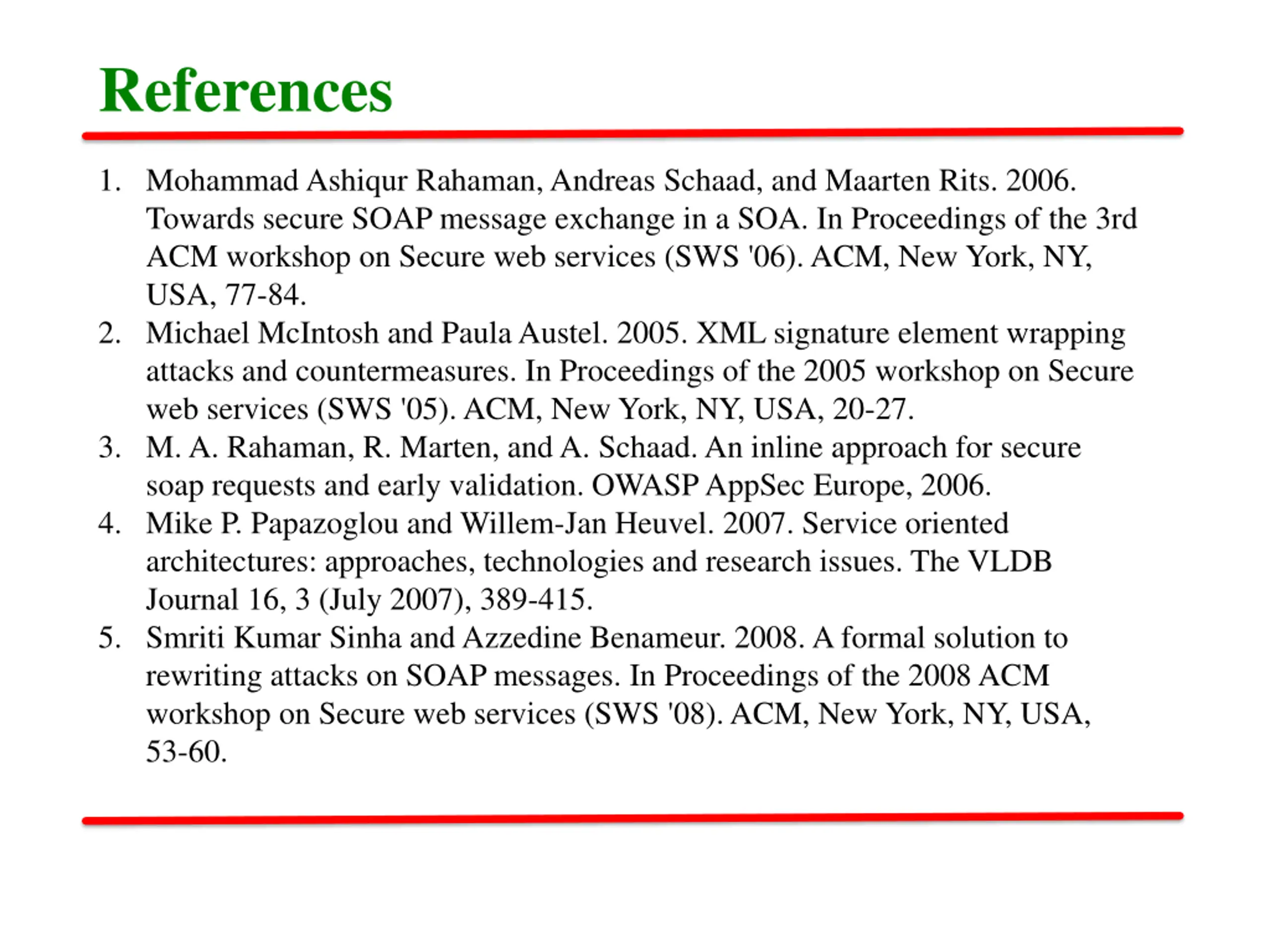 References 1. Mohammad Ashiqur Rahaman, Andreas Schaad, and Maarten Rits. 2006. Towards secure SOAP message exchange in a SOA. In Proceedings of the 3rd ACM workshop on Secure web services (SWS '06). ACM, New York, NY, USA, 77-84. 2. Michael McIntosh and Paula Austel. 2005. XML signature element wrapping attacks and countermeasures. In Proceedings of the 2005 workshop on Secure web services (SWS '05). ACM, New York, NY, USA, 20-27. 3. M. A. Rahaman, R. Marten, and A. Schaad. An inline approach for secure soap requests and early validation. OWASP AppSec Europe, 2006. 4. Mike P. Papazoglou and Willem-Jan Heuvel. 2007. Service oriented architectures: approaches, technologies and research issues. The VLDB Journal 16, 3 (July 2007), 389-415. 5. Smriti Kumar Sinha and Azzedine Benameur. 2008. A formal solution to rewriting attacks on SOAP messages. In Proceedings of the 2008 ACM workshop on Secure web services (SWS '08). ACM, New York, NY, USA, 53-60.