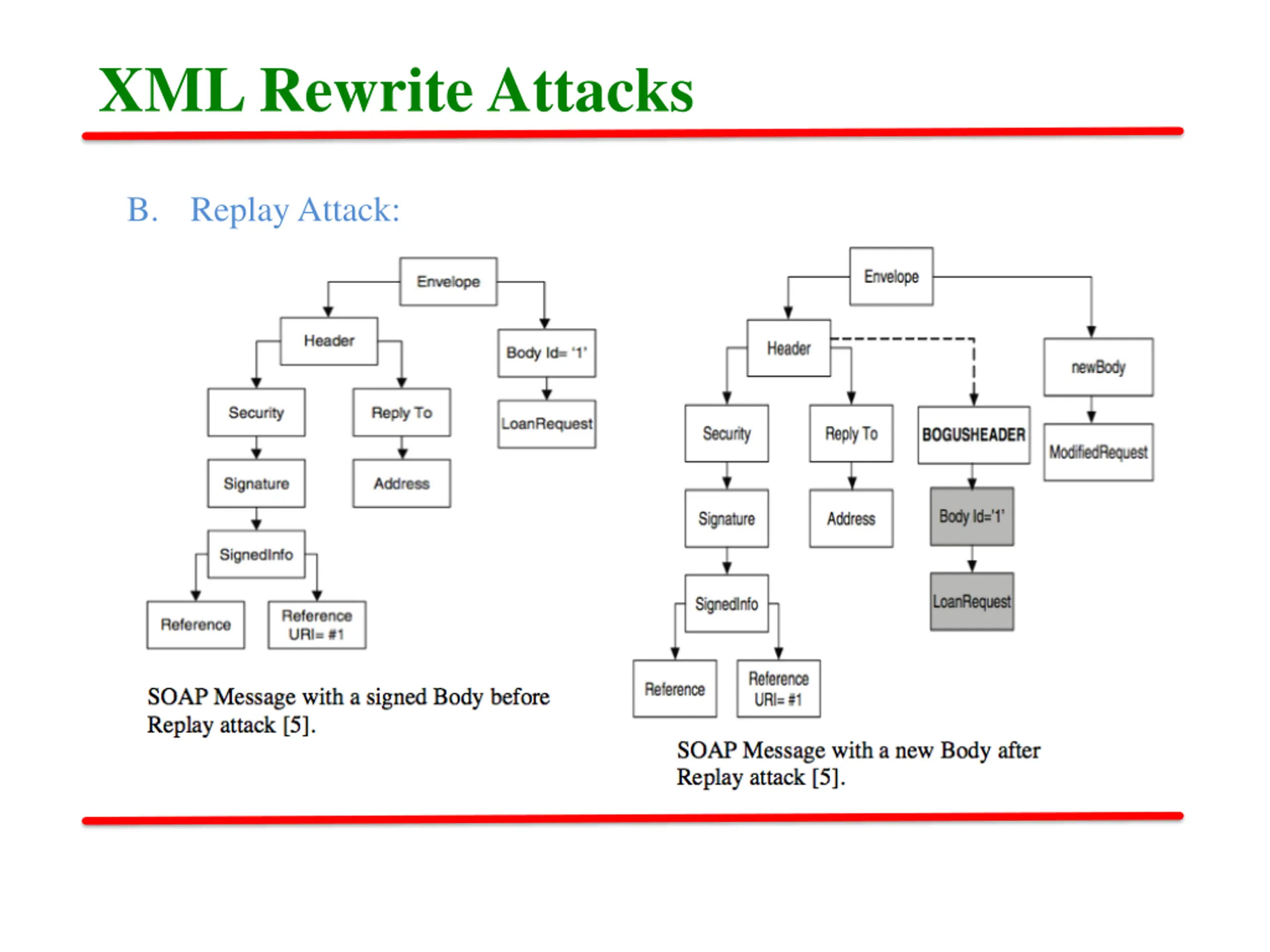 XML Rewrite Attacks SOAP message after XML rewrite attack: ( Source: [6], from references given on slides 15 & 16 )