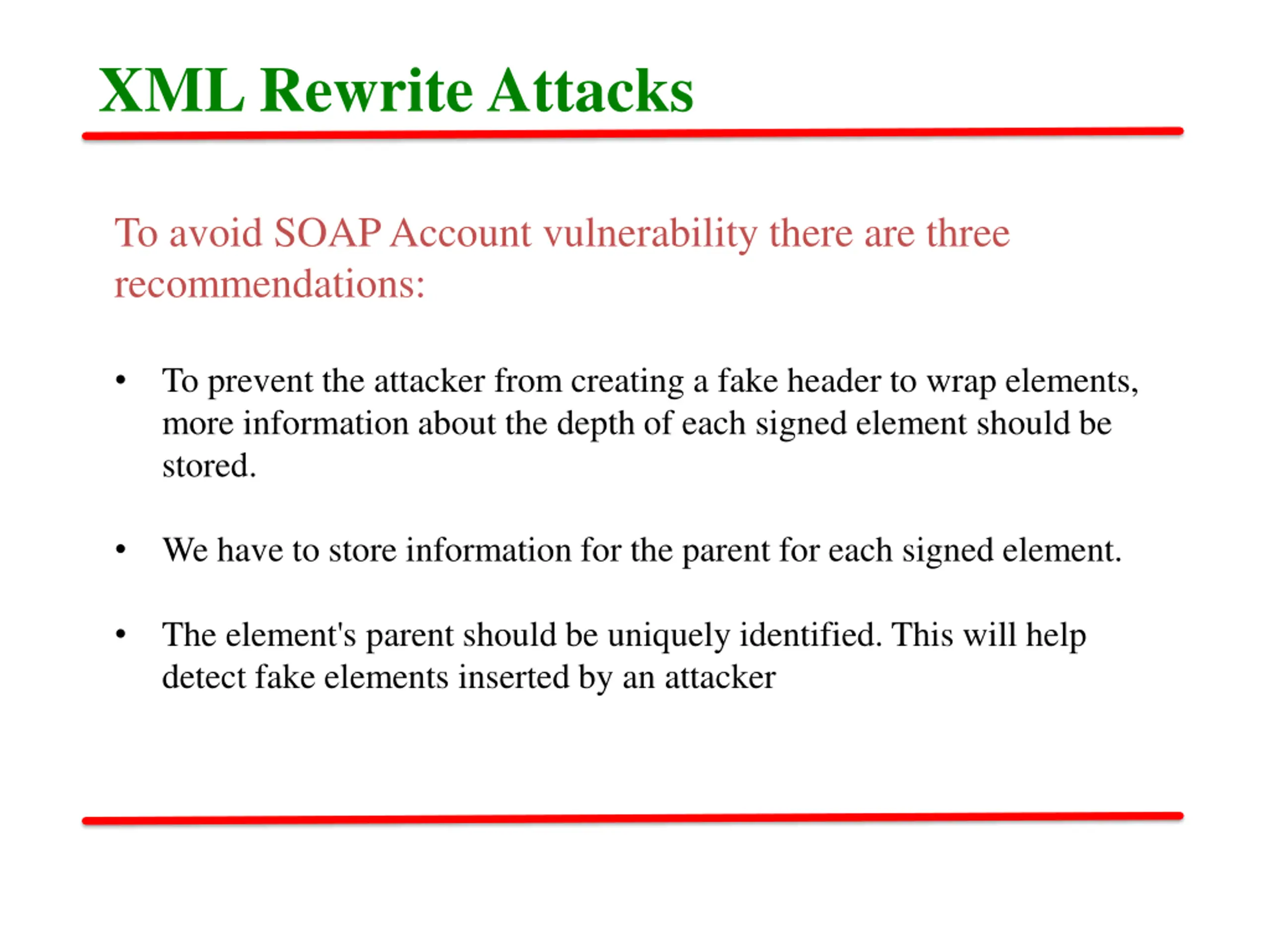 XML Rewrite Attacks To avoid SOAP Account vulnerability there are three recommendations: To prevent the attacker from creating a fake header to wrap elements, more information about the depth of each signed element should be stored. We have to store information for the parent for each signed element. The element's parent should be uniquely identified. This will help detect fake elements inserted by an attacker