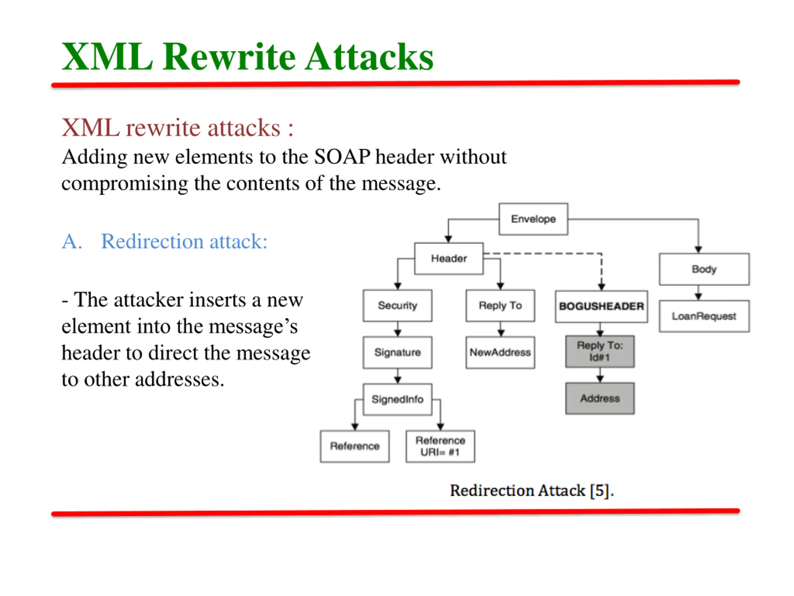 XML Rewrite Attacks XML rewrite attacks : Adding new elements to the SOAP header without compromising the contents of the message. A. Redirection attack: - The attacker inserts a new element into the message s header to direct the message to other addresses.