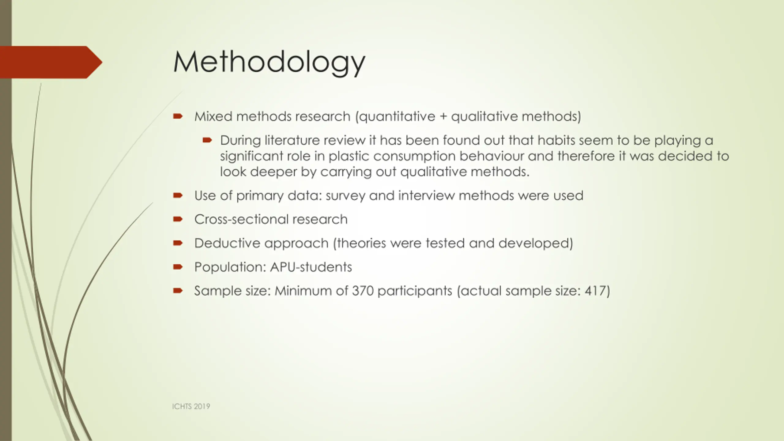 Methodology Mixed methods research (quantitative + qualitative methods) During literature review it has been found out that habits seem to be playing a significant role in plastic consumption behaviour and therefore it was decided to look deeper by carrying out qualitative methods. Use of primary data: survey and interview methods were used Cross-sectional research Deductive approach (theories were tested and developed) Population: APU-students Sample size: Minimum of 370 participants (actual sample size: 417) ICHTS 2019