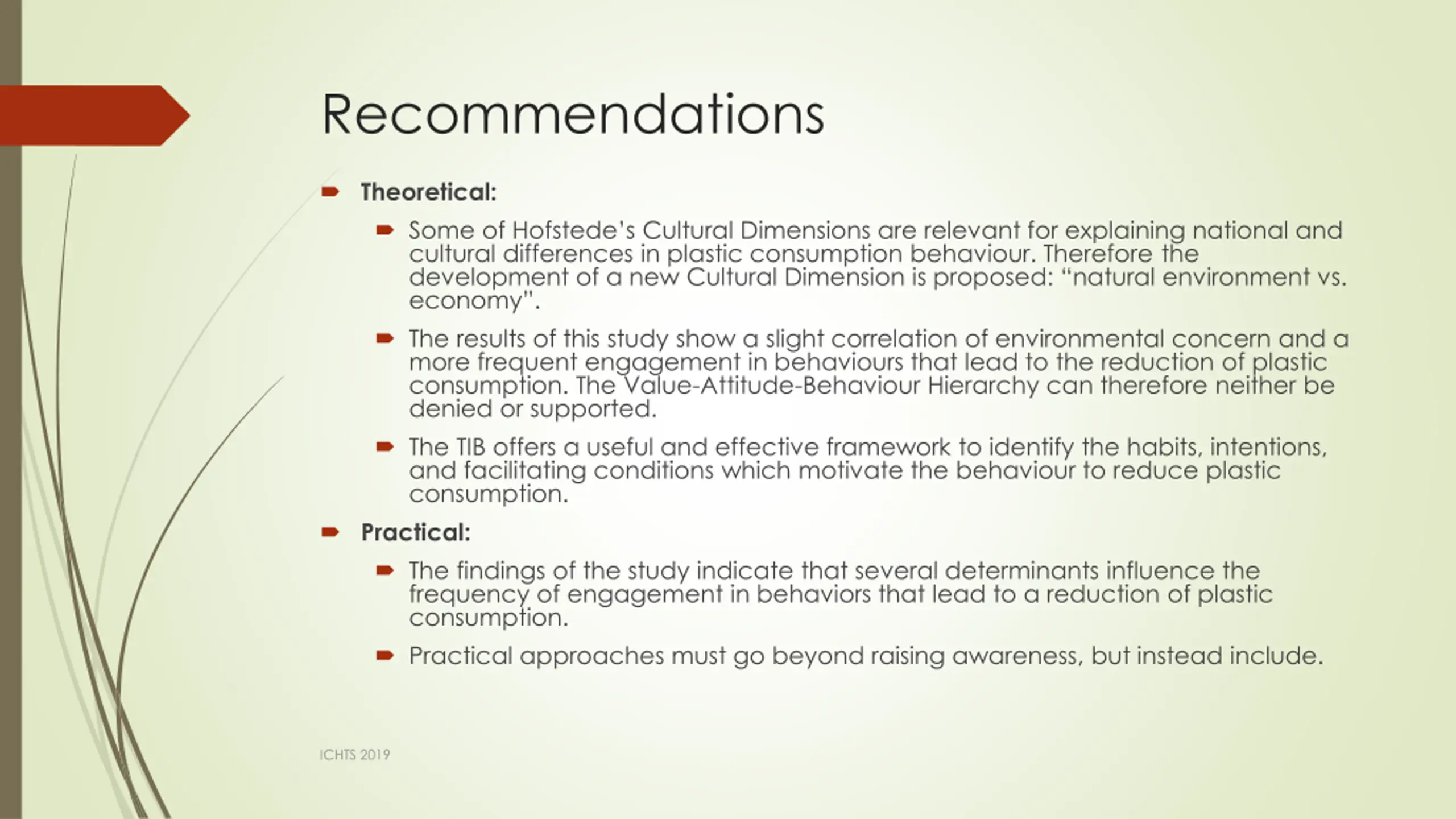 Recommendations Theoretical: Some of Hofstede s Cultural Dimensions are relevant for explaining national and cultural differences in plastic consumption behaviour. Therefore the development of a new Cultural Dimension is proposed: natural environment vs. economy . The results of this study show a slight correlation of environmental concern and a more frequent engagement in behaviours that lead to the reduction of plastic consumption. The Value-Attitude-Behaviour Hierarchy can therefore neither be denied or supported. The TIB offers a useful and effective framework to identify the habits, intentions, and facilitating conditions which motivate the behaviour to reduce plastic consumption. Practical: The findings of the study indicate that several determinants influence the frequency of engagement in behaviors that lead to a reduction of plastic consumption. Practical approaches must go beyond raising awareness, but instead include. ICHTS 2019