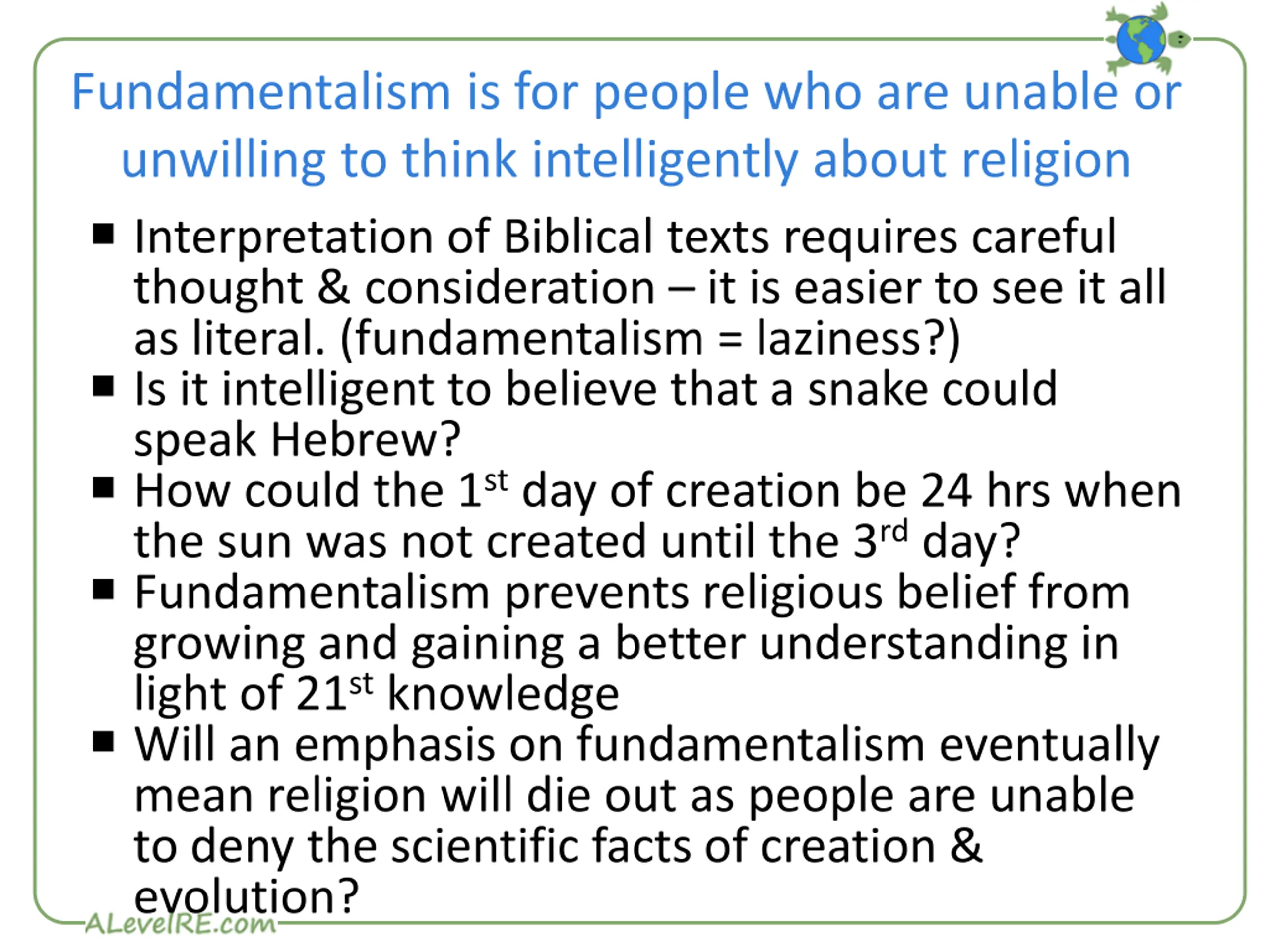 Fundamentalism is for people who are unable or unwilling to think intelligently about religion Interpretation of Biblical texts requires careful thought & consideration it is easier to see it all as literal. (fundamentalism = laziness?) Is it intelligent to believe that a snake could speak Hebrew? How could the 1st day of creation be 24 hrs when the sun was not created until the 3rd day? Fundamentalism prevents religious belief from growing and gaining a better understanding in light of 21st knowledge Will an emphasis on fundamentalism eventually mean religion will die out as people are unable to deny the scientific facts of creation & evolution?