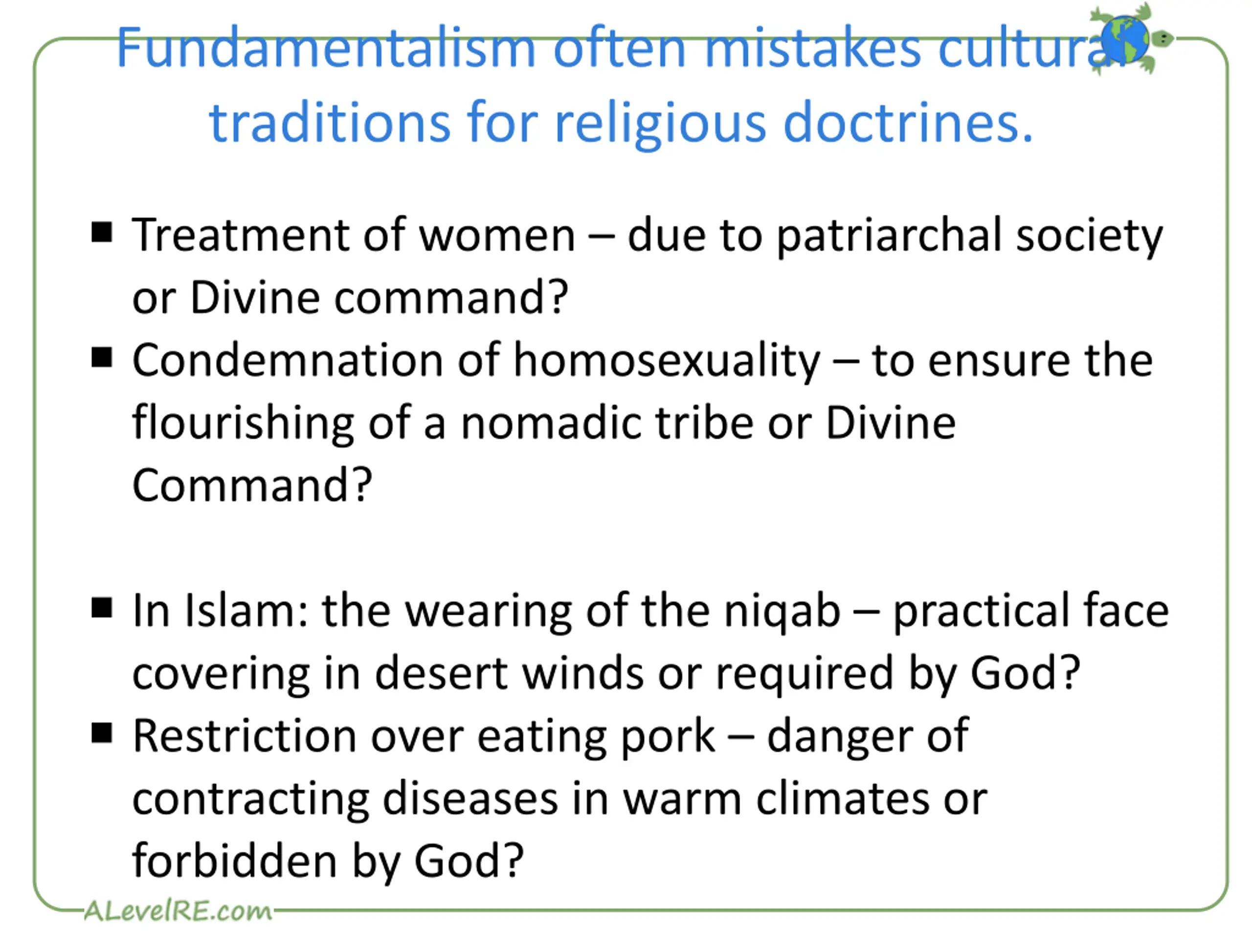 Fundamentalism often mistakes cultural traditions for religious doctrines. Treatment of women due to patriarchal society or Divine command? Condemnation of homosexuality to ensure the flourishing of a nomadic tribe or Divine Command? In Islam: the wearing of the niqab practical face covering in desert winds or required by God? Restriction over eating pork danger of contracting diseases in warm climates or forbidden by God?