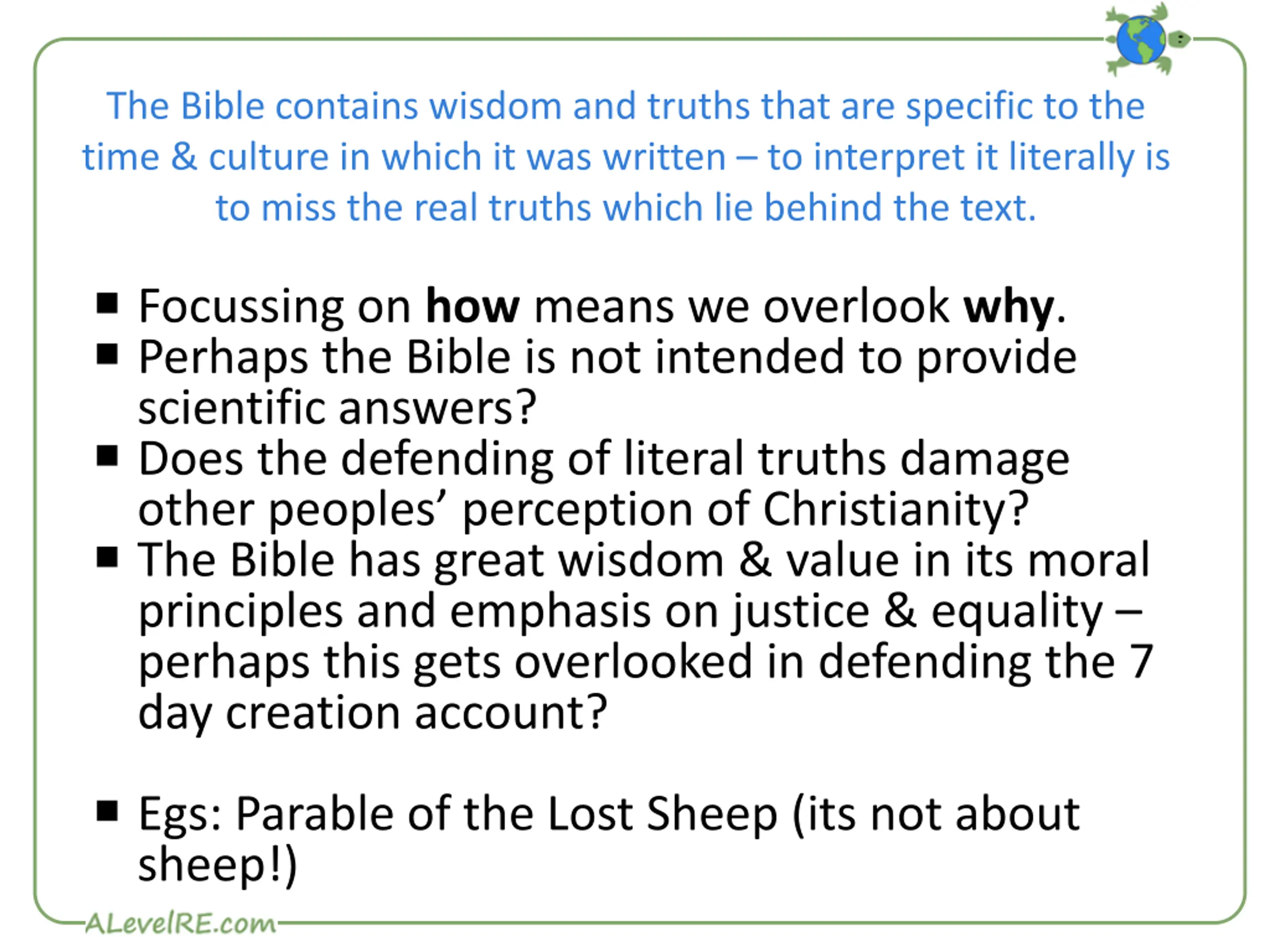 The Bible contains wisdom and truths that are specific to the time & culture in which it was written to interpret it literally is to miss the real truths which lie behind the text. Focussing on how means we overlook why. Perhaps the Bible is not intended to provide scientific answers? Does the defending of literal truths damage other peoples perception of Christianity? The Bible has great wisdom & value in its moral principles and emphasis on justice & equality perhaps this gets overlooked in defending the 7 day creation account? Egs: Parable of the Lost Sheep (its not about sheep!)