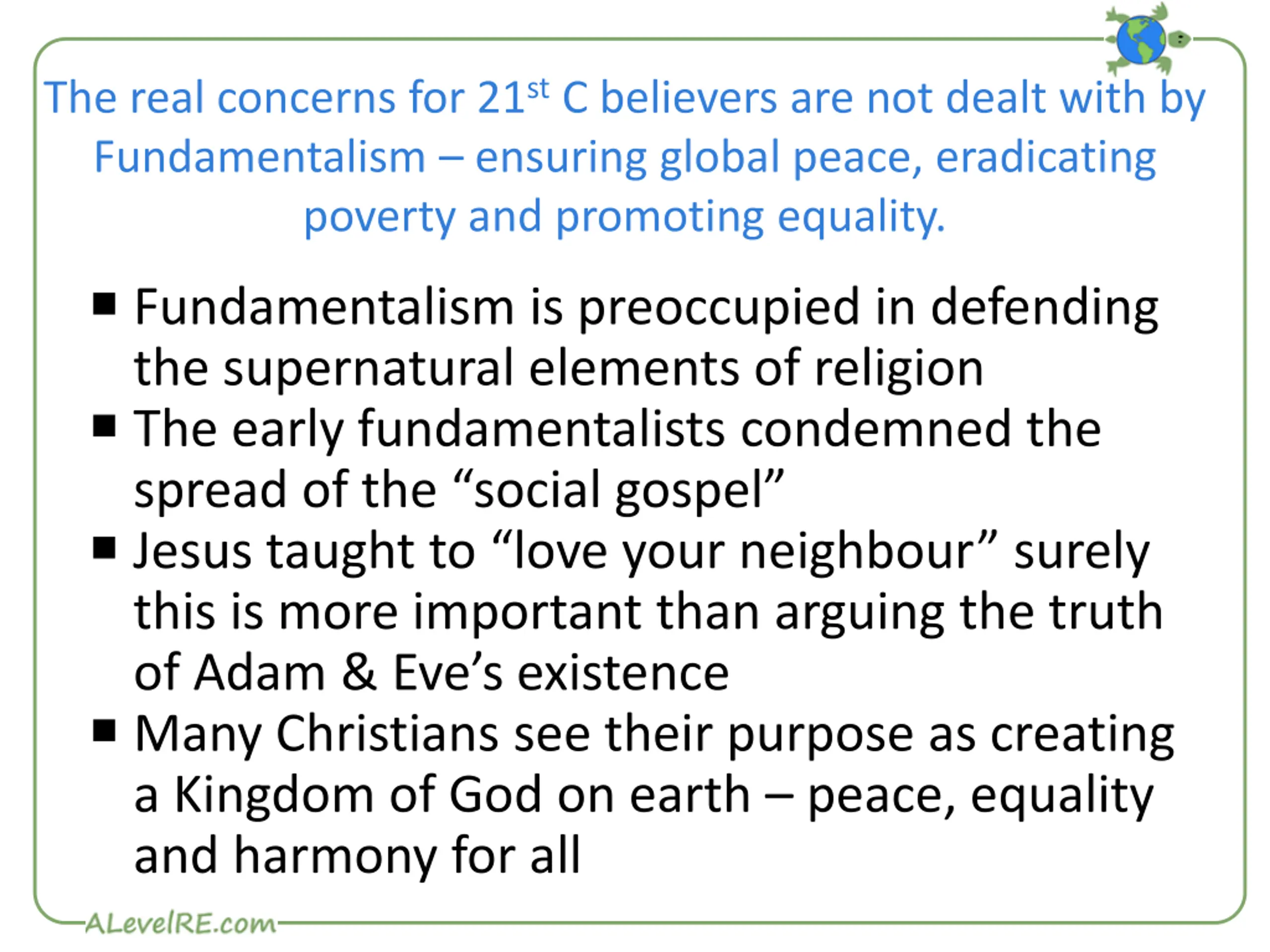 The real concerns for 21st C believers are not dealt with by Fundamentalism ensuring global peace, eradicating poverty and promoting equality. Fundamentalism is preoccupied in defending the supernatural elements of religion The early fundamentalists condemned the spread of the social gospel Jesus taught to love your neighbour surely this is more important than arguing the truth of Adam & Eve s existence Many Christians see their purpose as creating a Kingdom of God on earth peace, equality and harmony for all