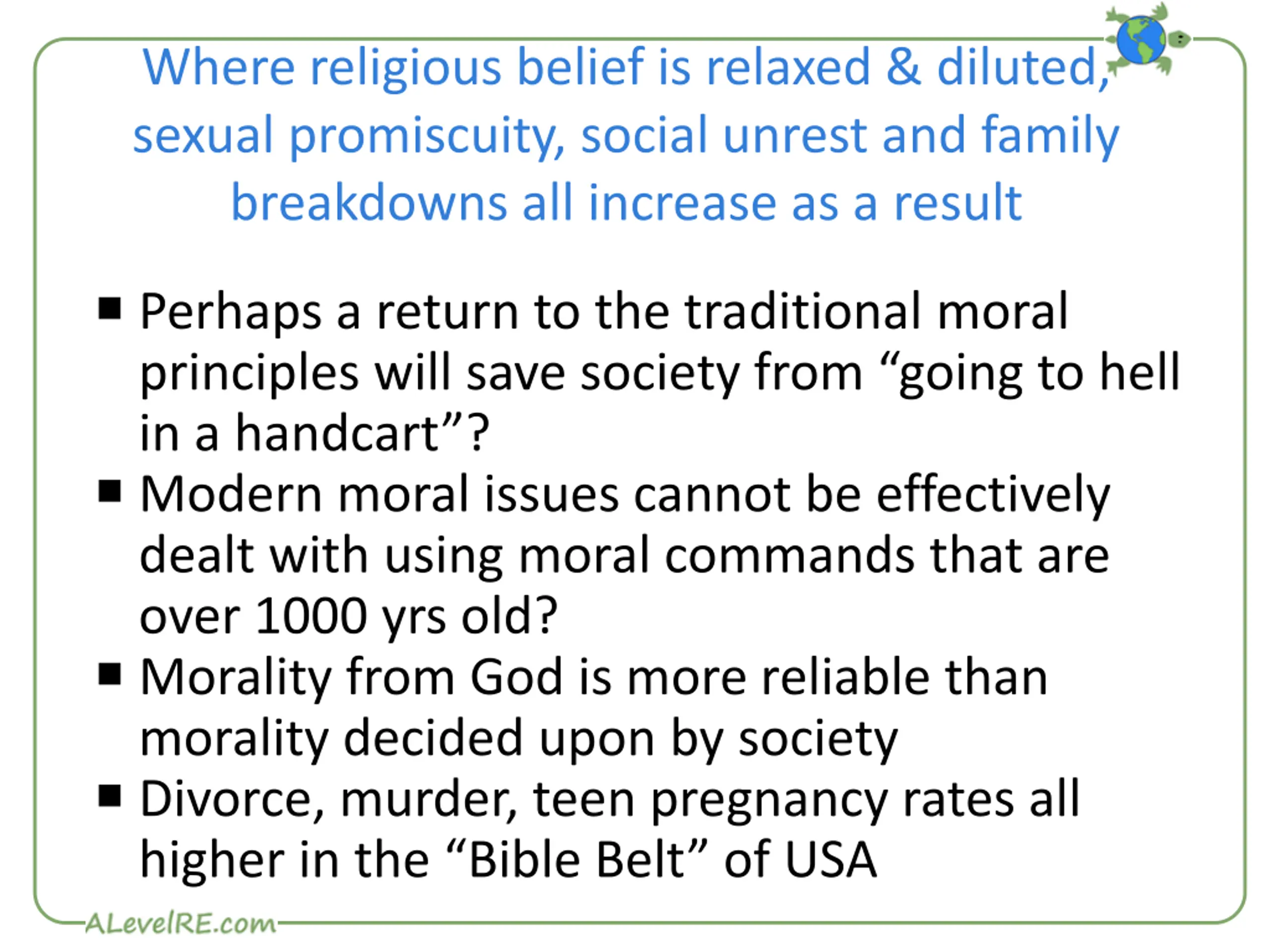 Where religious belief is relaxed & diluted, sexual promiscuity, social unrest and family breakdowns all increase as a result Perhaps a return to the traditional moral principles will save society from going to hell in a handcart ? Modern moral issues cannot be effectively dealt with using moral commands that are over 1000 yrs old? Morality from God is more reliable than morality decided upon by society Divorce, murder, teen pregnancy rates all higher in the Bible Belt of USA