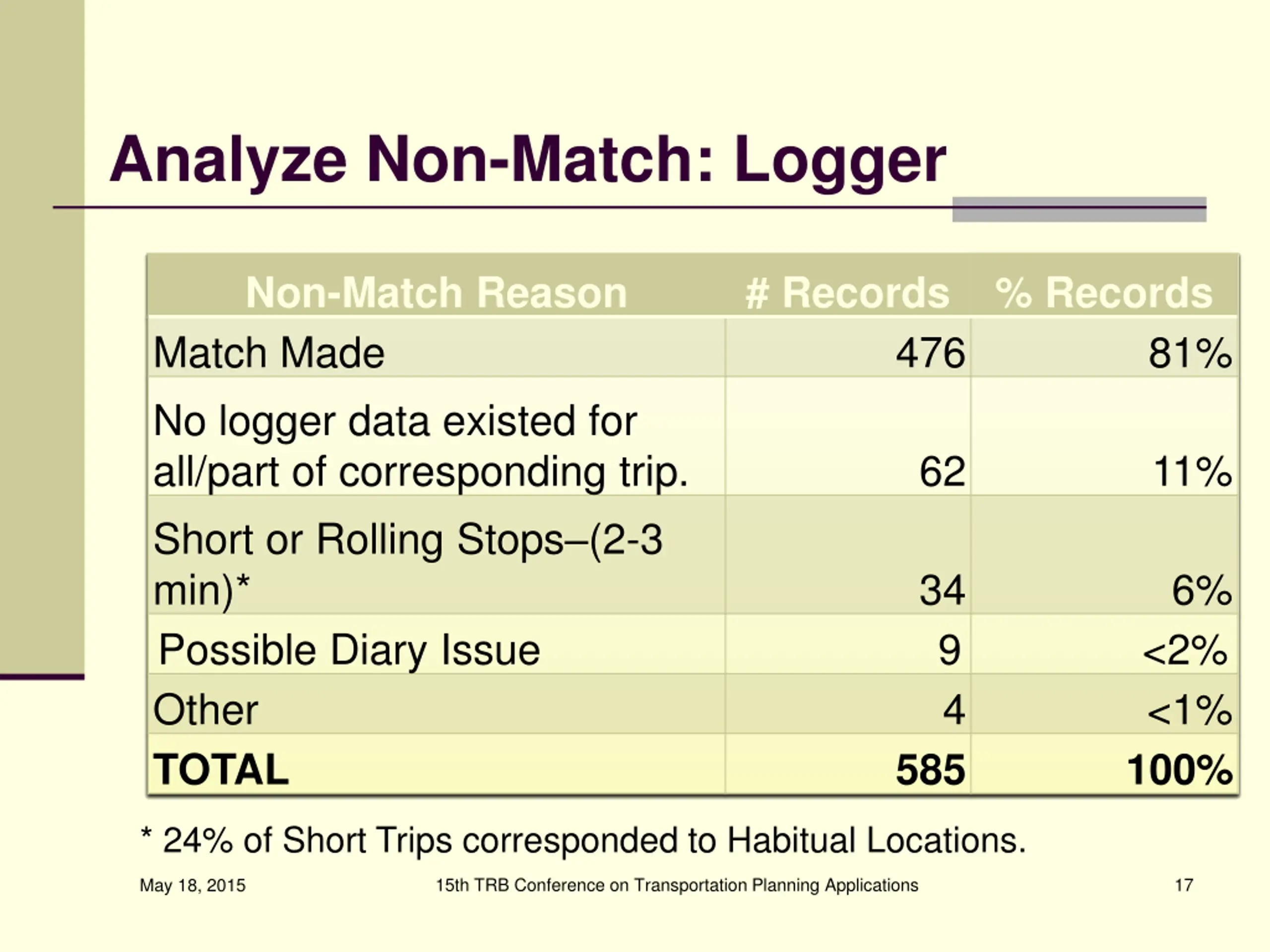 Analyze Non-Match: Logger Non-Match Reason Match Made Match Made No logger data existed for all/part of corresponding trip. all/part of corresponding trip. Short or Rolling Stops (2-3 min)* min)* Possible Diary Issue Other TOTAL Non-Match Reason Match Made Non-Match Reason Non-Match Reason Match Made No logger data existed for No logger data existed for all/part of corresponding trip. Short or Rolling Stops (2-3 # Records # Records # Records # Records % Records % Records % Records % Records 476 476 476 476 81% 81% 81% 81% 62 62 62 11% 11% 11% 34 34 9 6% 6% <2% <1% 4 TOTAL TOTAL TOTAL 585 585 585 585 100% 100% 100% 100% * 24% of Short Trips corresponded to Habitual Locations. 15th TRB Conference on Transportation Planning Applications 17 May 18, 2015
