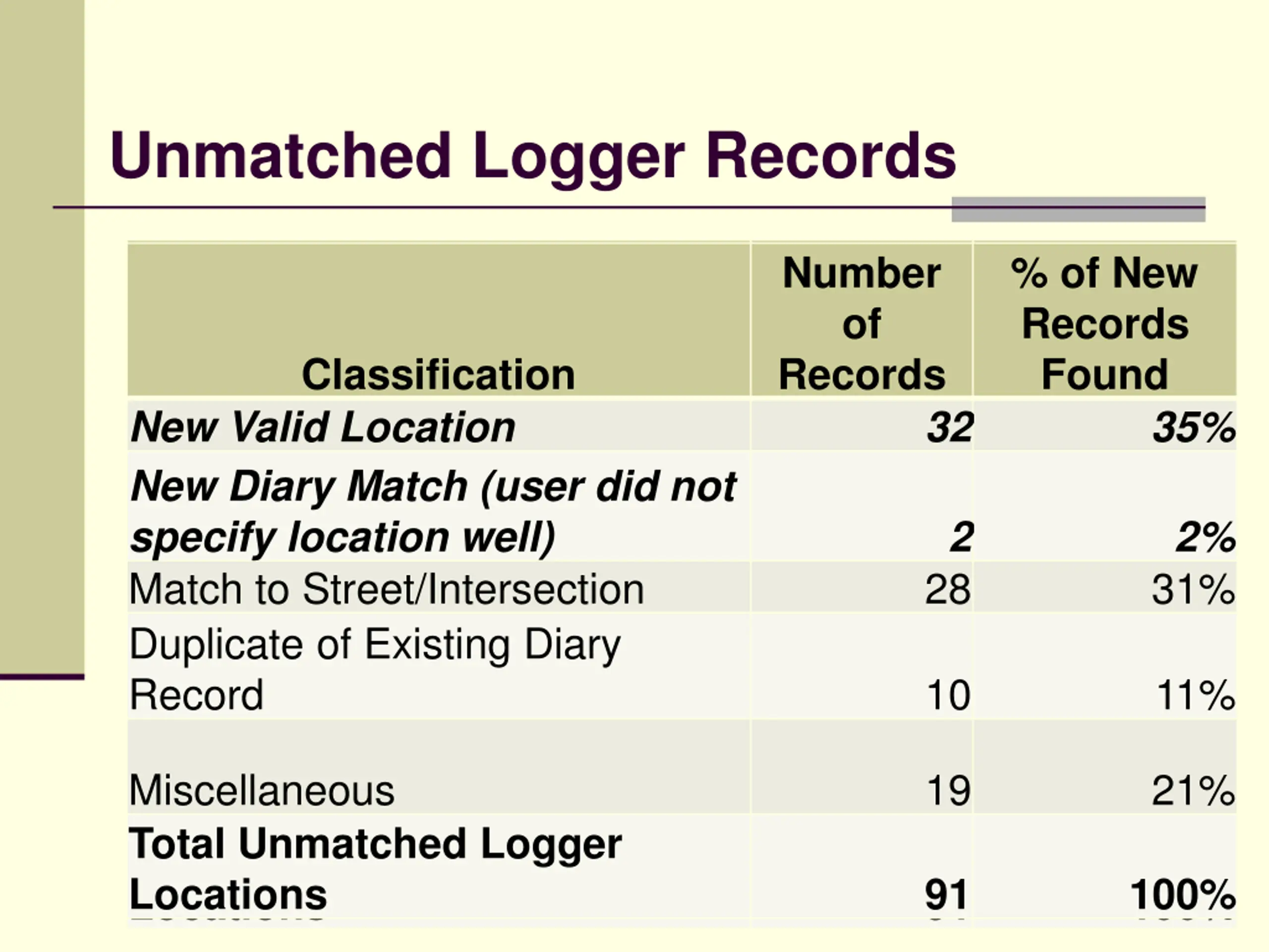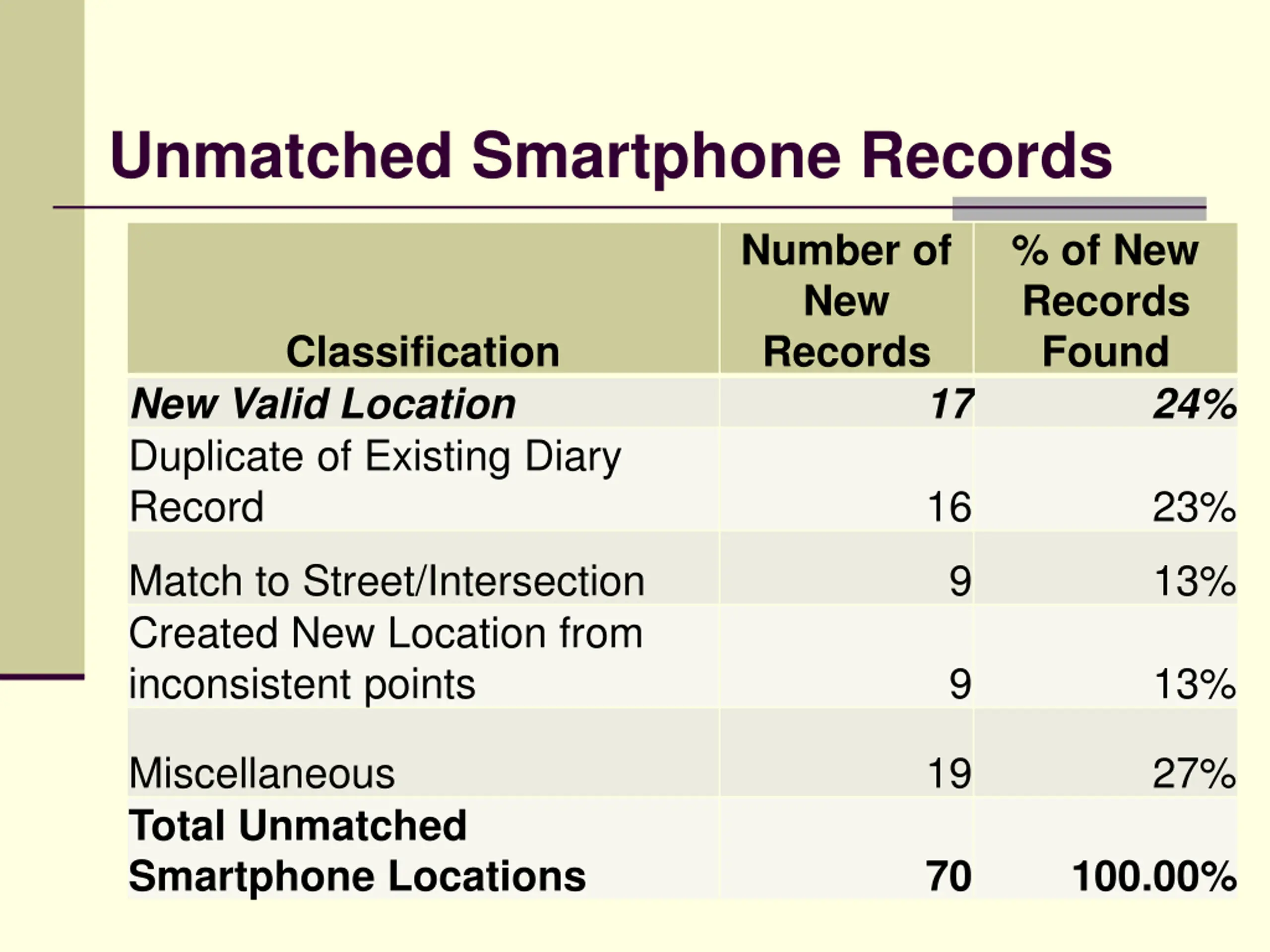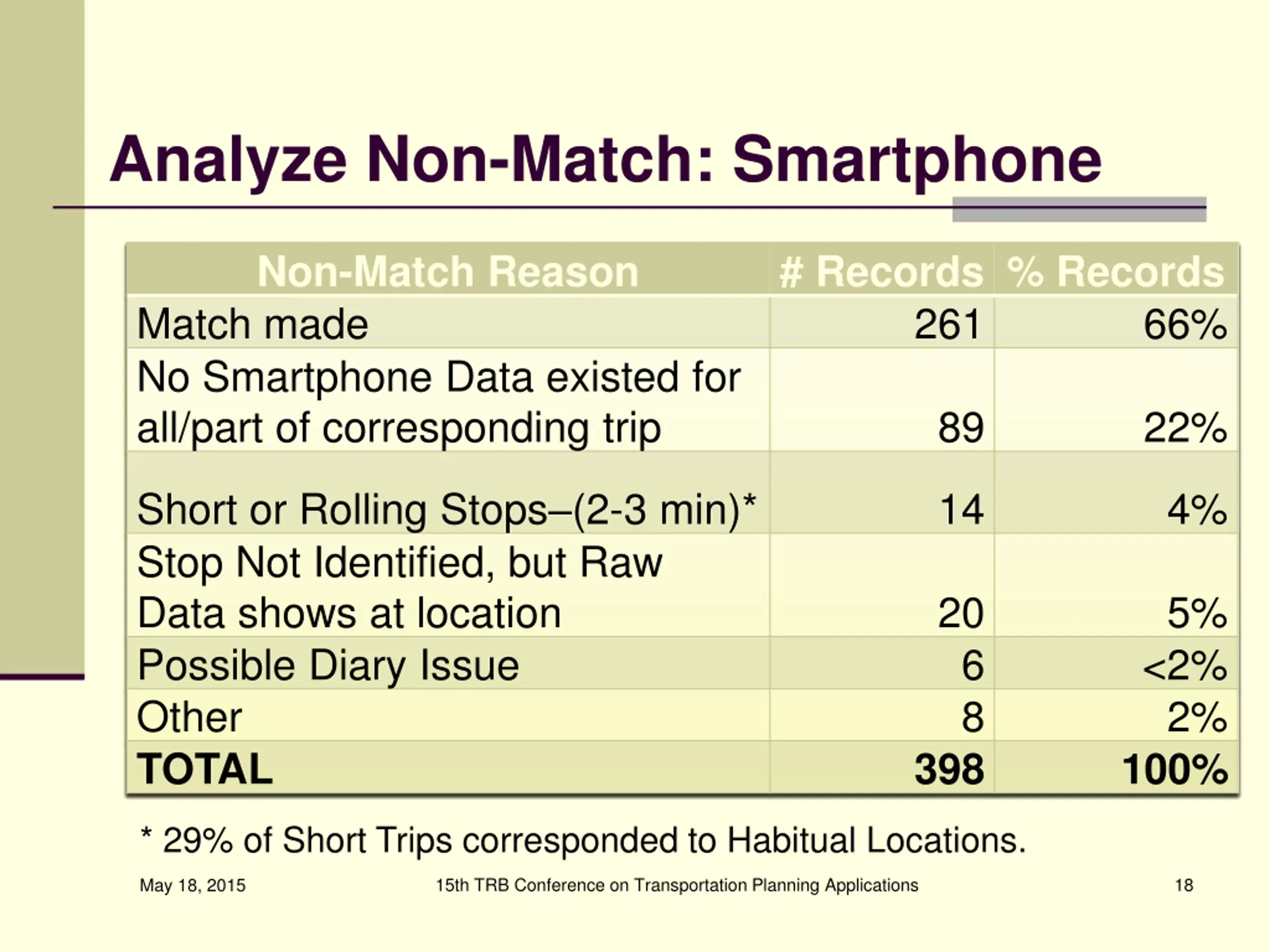 Unmatched Technology Records Did the technology capture stops that the user made but did not record in the diary? NCTCOG looked at longitude/latitude of unmatched technology records to determine: if it was a valid location is it a reasonable stop given the rest of the user s travel diary stops. 15th TRB Conference on Transportation Planning Applications 19 May 18, 2015