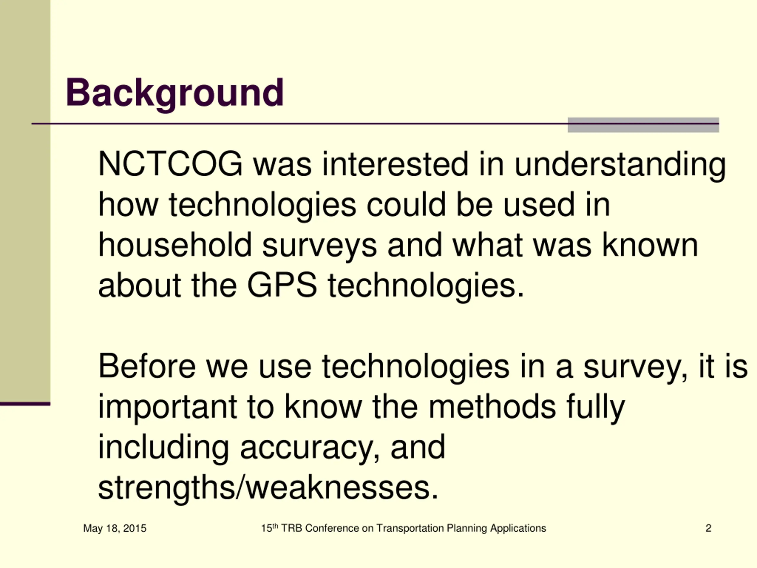Background NCTCOG was interested in understanding how technologies could be used in household surveys and what was known about the GPS technologies. Before we use technologies in a survey, it is important to know the methods fully including accuracy, and strengths/weaknesses. 15th TRB Conference on Transportation Planning Applications 2 May 18, 2015