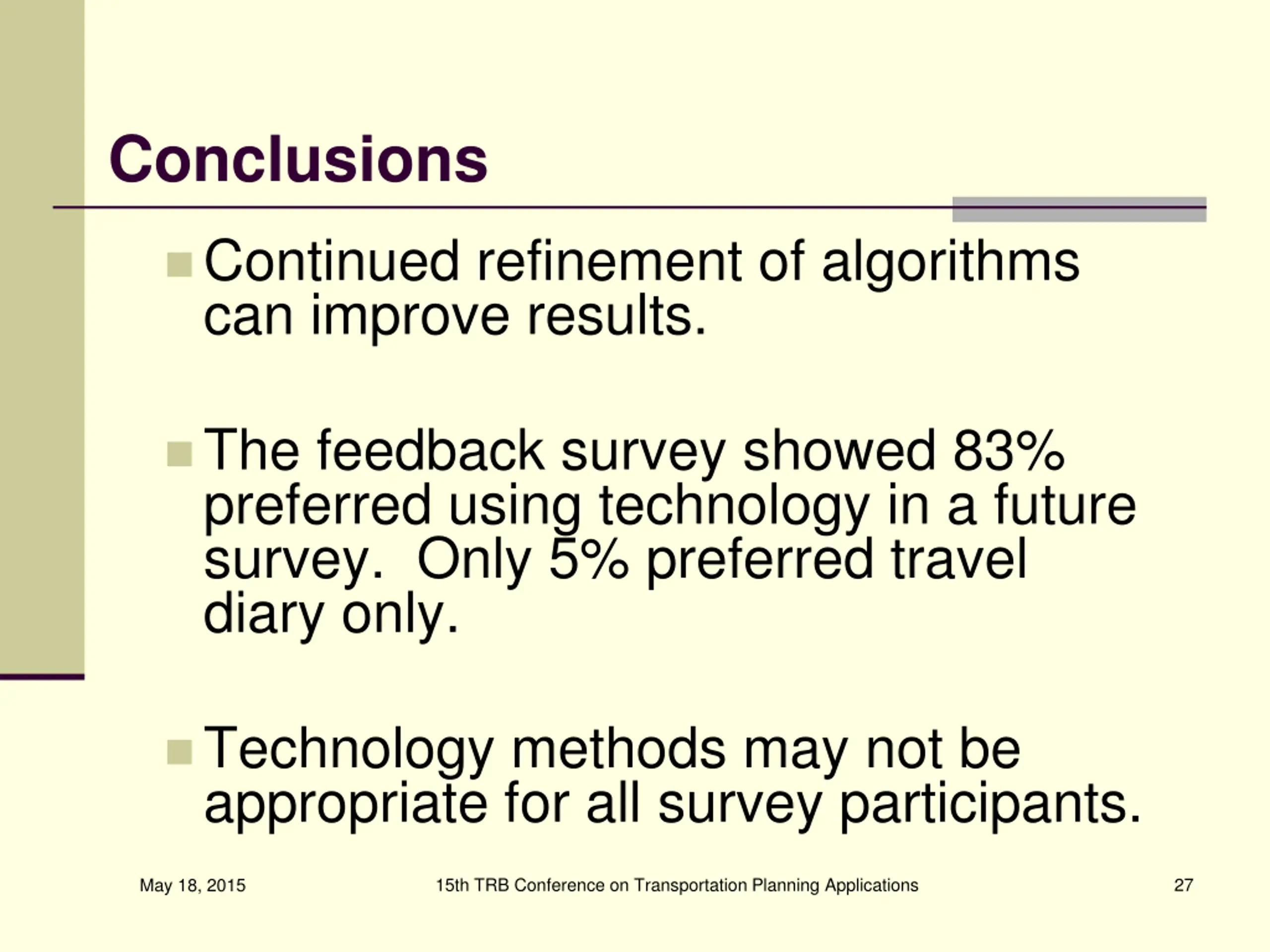 Conclusions Continued refinement of algorithms can improve results. The feedback survey showed 83% preferred using technology in a future survey. Only 5% preferred travel diary only. Technology methods may not be appropriate for all survey participants. 15th TRB Conference on Transportation Planning Applications 27 May 18, 2015