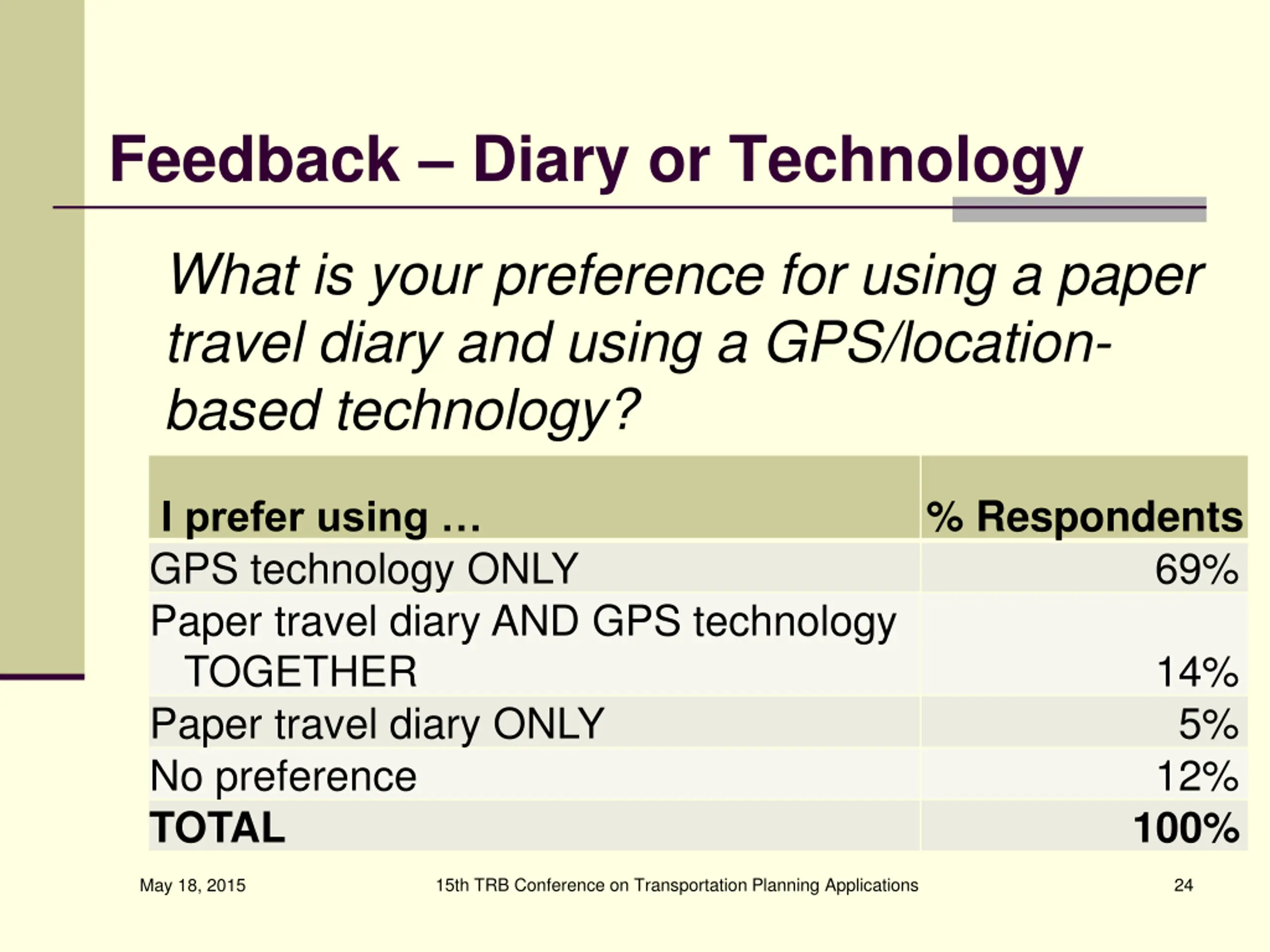 Feedback Diary or Technology What is your preference for using a paper travel diary and using a GPS/location- based technology? % Respondents I prefer using GPS technology ONLY Paper travel diary AND GPS technology TOGETHER Paper travel diary ONLY No preference TOTAL 69% 14% 5% 12% 100% 15th TRB Conference on Transportation Planning Applications 24 May 18, 2015