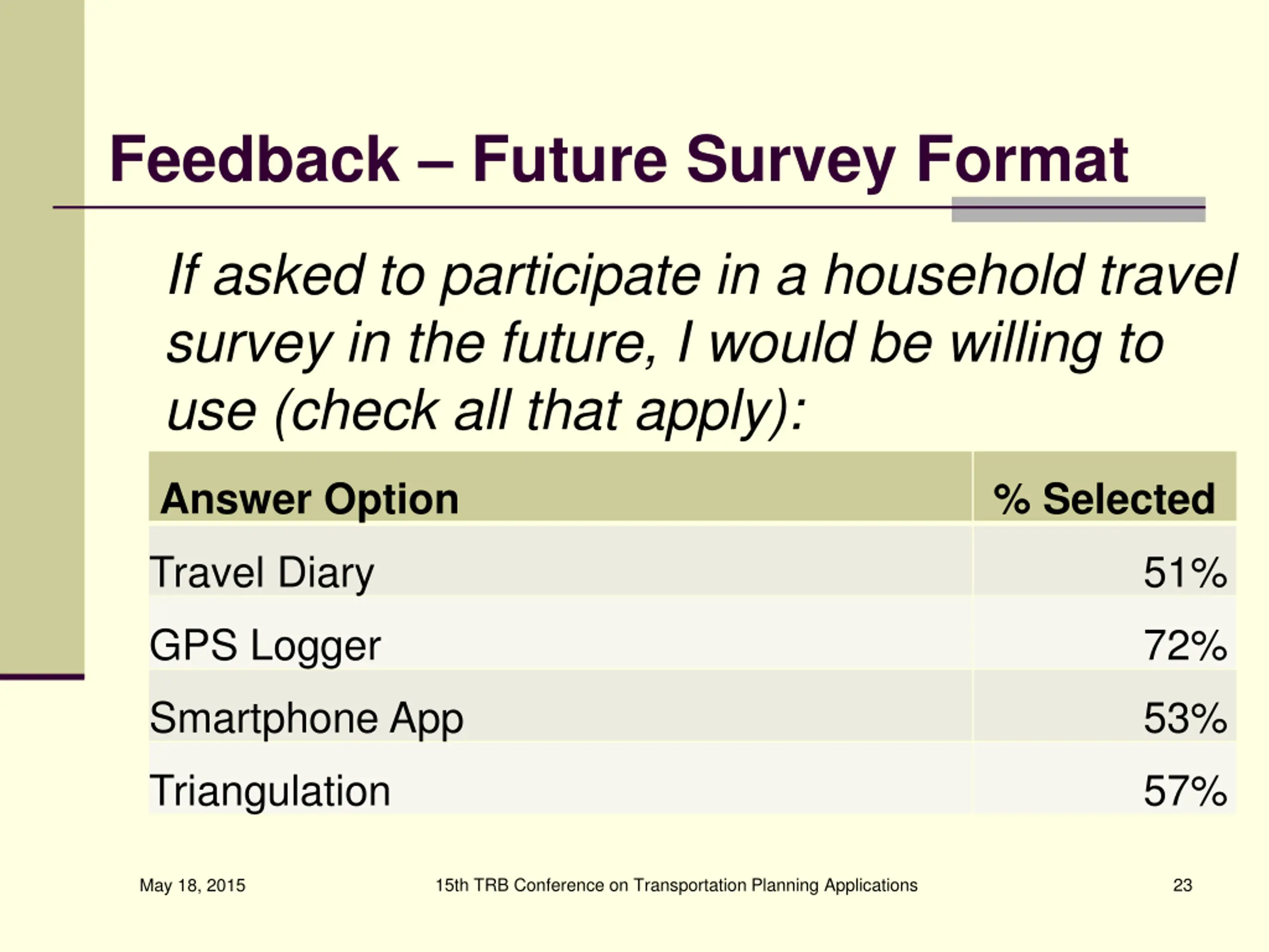 Feedback Future Survey Format If asked to participate in a household travel survey in the future, I would be willing to use (check all that apply): Answer Option % Selected Travel Diary 51% GPS Logger 72% Smartphone App 53% Triangulation 57% 15th TRB Conference on Transportation Planning Applications 23 May 18, 2015