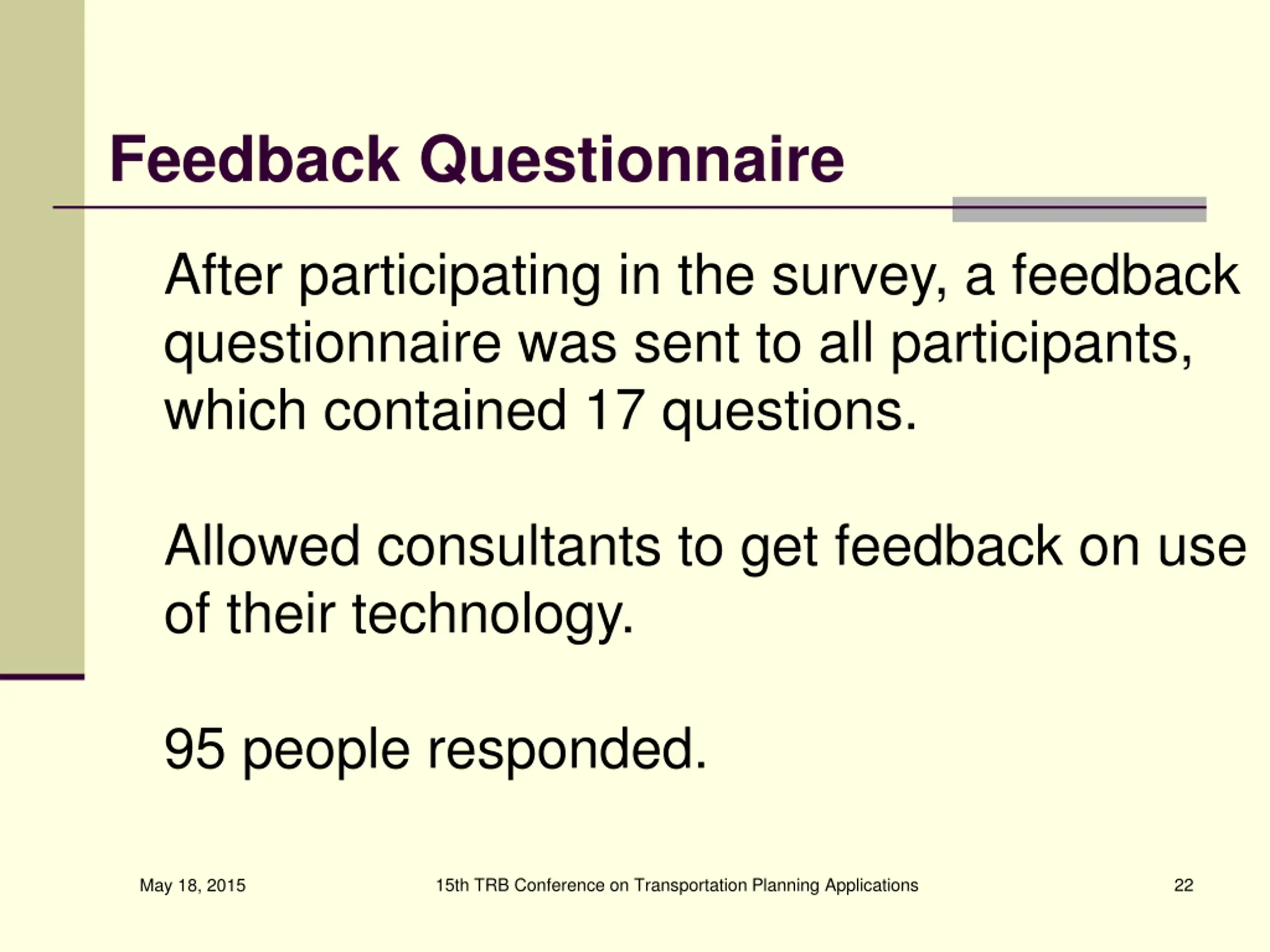 Feedback Questionnaire After participating in the survey, a feedback questionnaire was sent to all participants, which contained 17 questions. Allowed consultants to get feedback on use of their technology. 95 people responded. 15th TRB Conference on Transportation Planning Applications 22 May 18, 2015