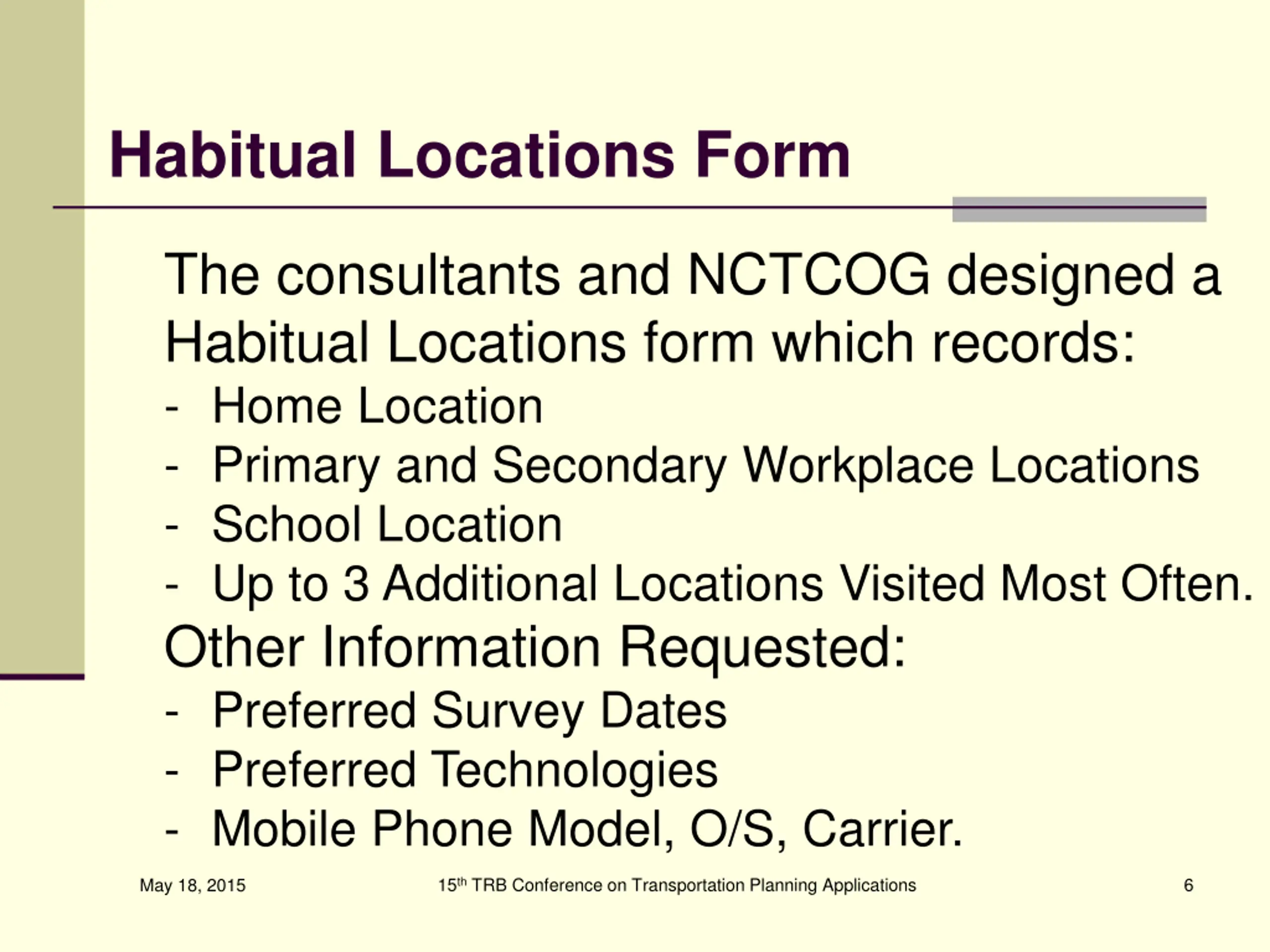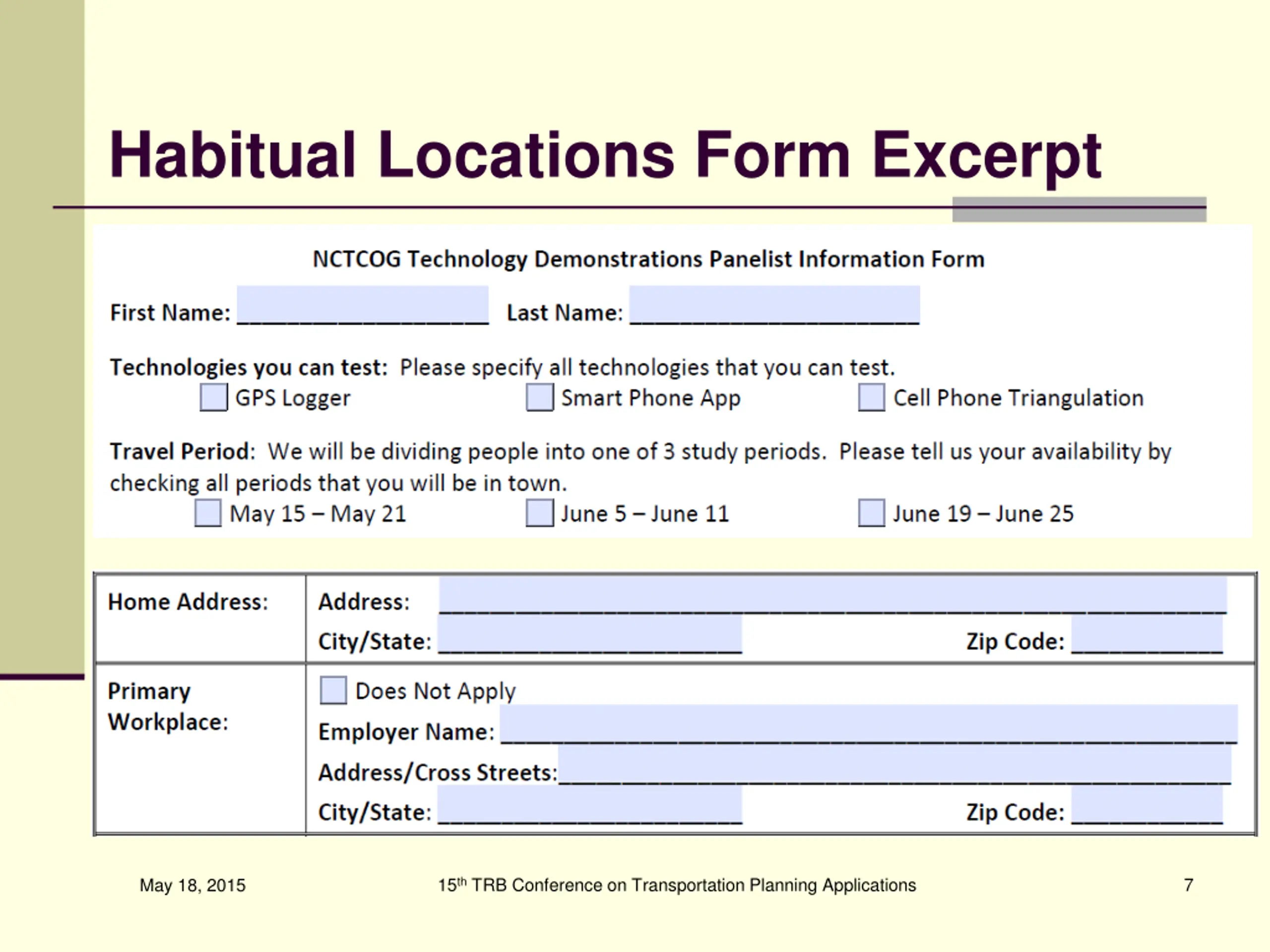Habitual Locations Form The consultants and NCTCOG designed a Habitual Locations form which records: - Home Location - Primary and Secondary Workplace Locations - School Location - Up to 3 Additional Locations Visited Most Often. Other Information Requested: - Preferred Survey Dates - Preferred Technologies - Mobile Phone Model, O/S, Carrier. 15th TRB Conference on Transportation Planning Applications 6 May 18, 2015