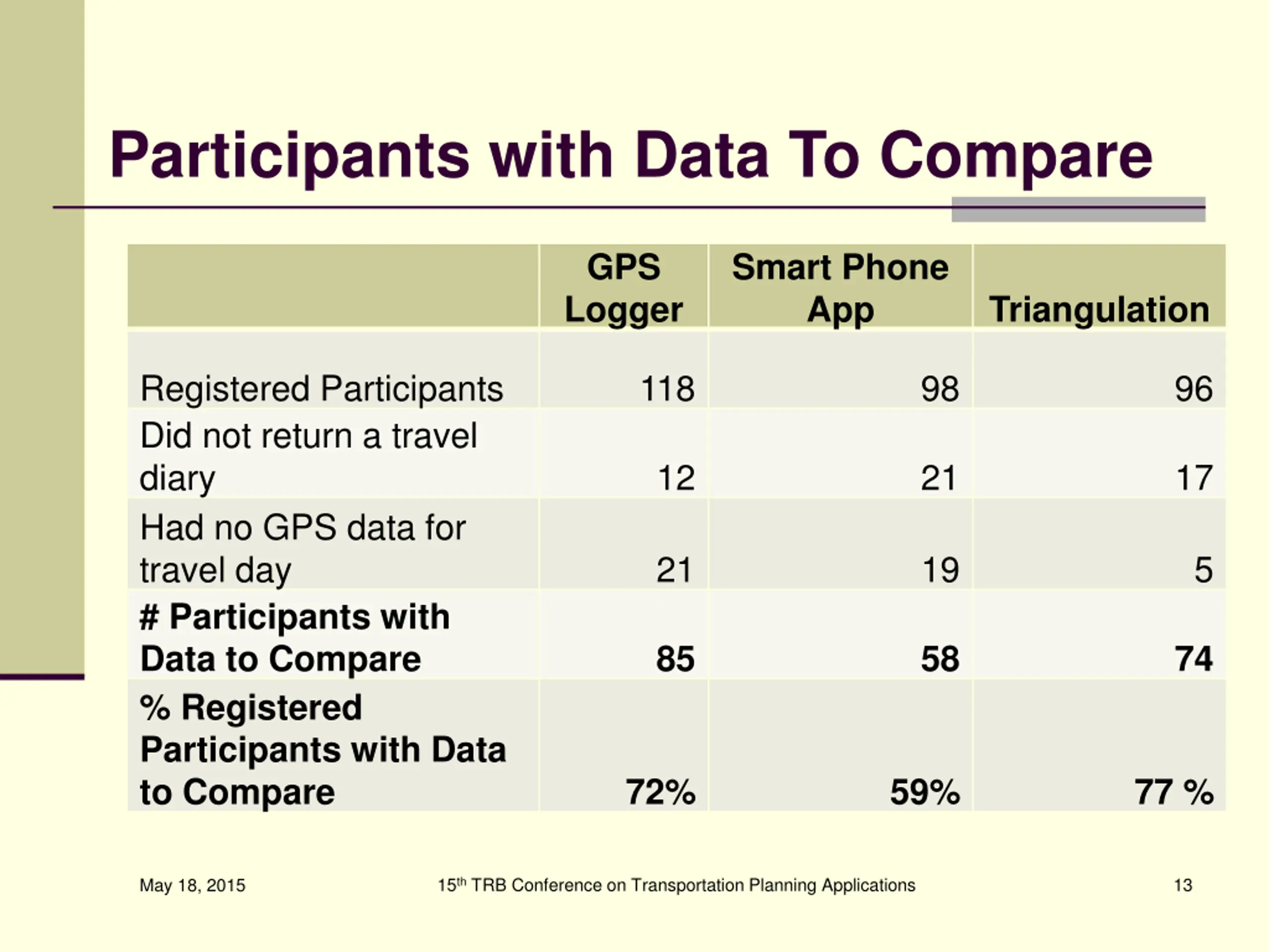 Participants with Data To Compare GPS Logger Logger Logger Logger GPS GPS GPS Smart Phone Smart Phone Smart Phone Smart Phone App App App App Triangulation Triangulation Triangulation Triangulation Registered Participants Registered Participants Did not return a travel diary diary Had no GPS data for travel day travel day # Participants with Data to Compare % Registered Participants with Data to Compare Registered Participants Did not return a travel Did not return a travel diary Had no GPS data for Registered Participants 118 118 118 118 98 98 98 98 96 96 96 96 12 12 12 21 21 21 17 17 17 21 21 19 19 5 5 85 58 74 72% 59% 77 % 15th TRB Conference on Transportation Planning Applications 13 May 18, 2015