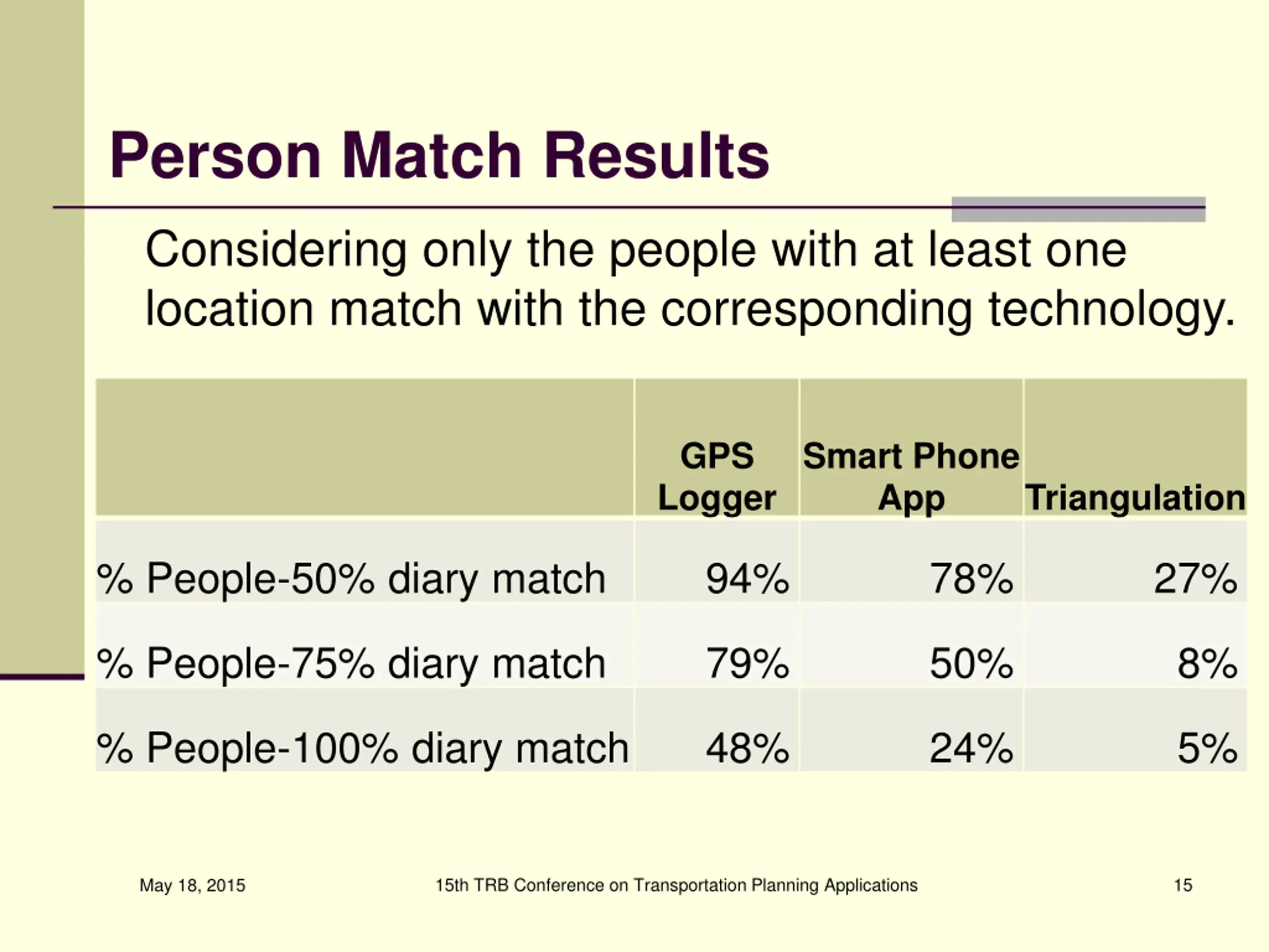 Person Match Results Considering only the people with at least one location match with the corresponding technology. GPS Logger Smart Phone App Triangulation % People-50% diary match 94% 78% 27% % People-75% diary match 79% 50% 8% % People-100% diary match 48% 24% 5% 15th TRB Conference on Transportation Planning Applications 15 May 18, 2015