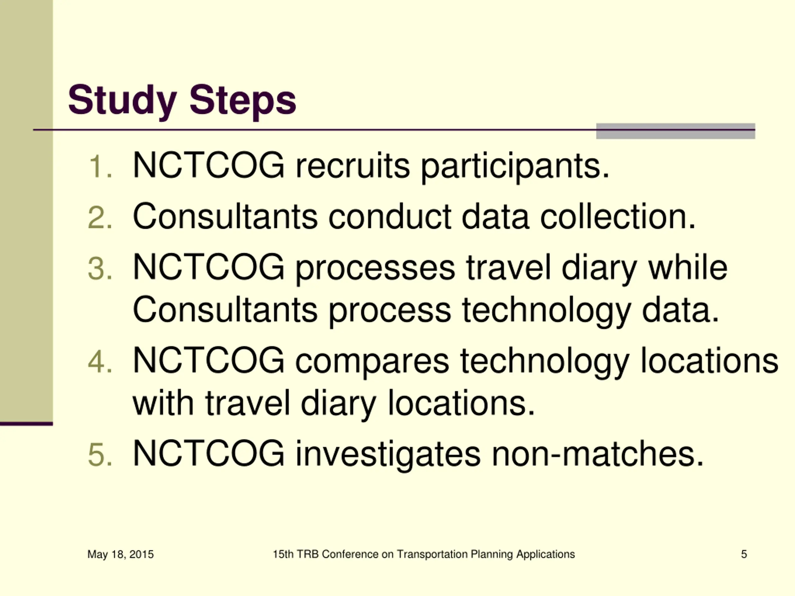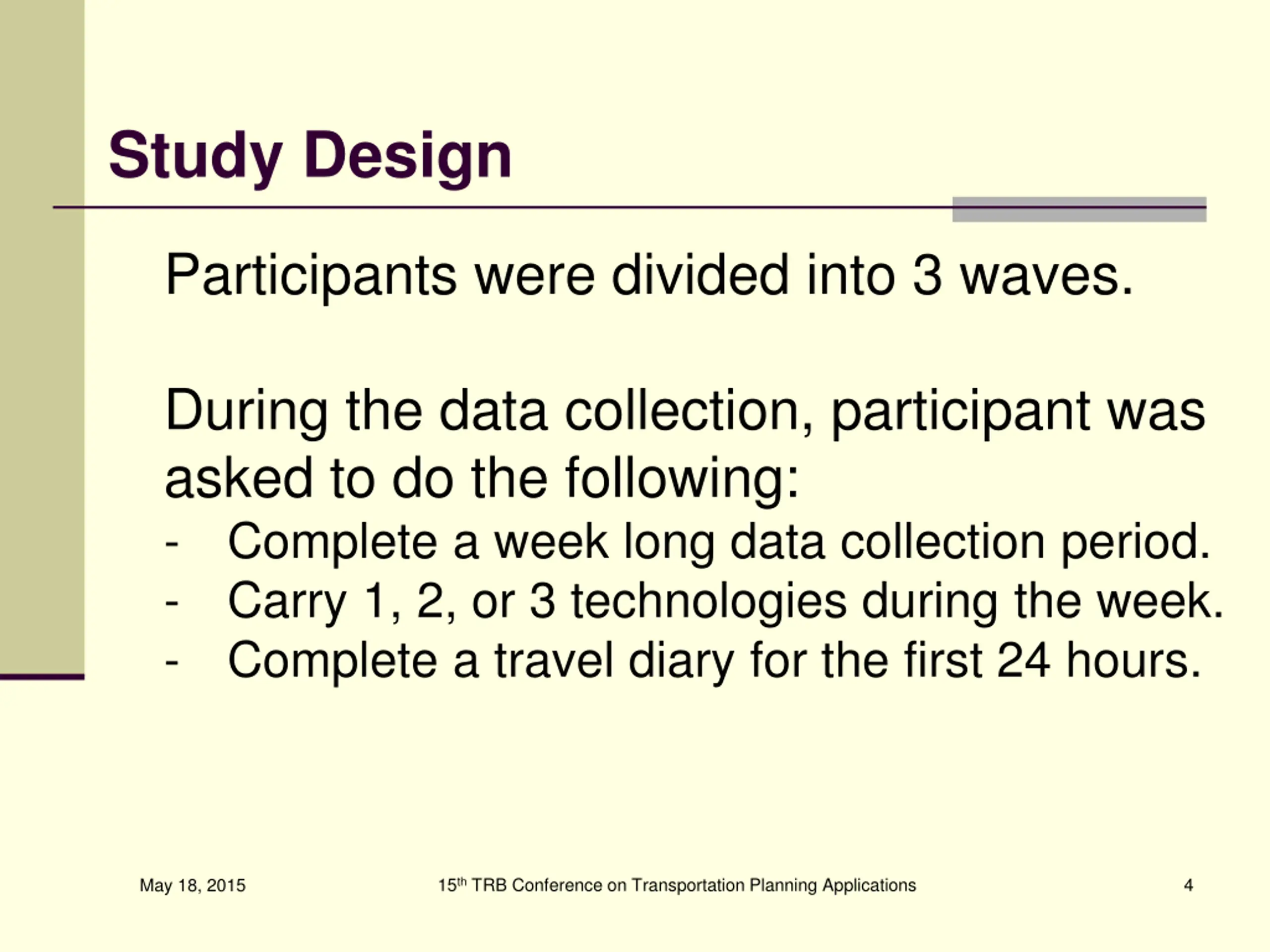 Study Design Participants were divided into 3 waves. During the data collection, participant was asked to do the following: - Complete a week long data collection period. - Carry 1, 2, or 3 technologies during the week. - Complete a travel diary for the first 24 hours. 15th TRB Conference on Transportation Planning Applications 4 May 18, 2015