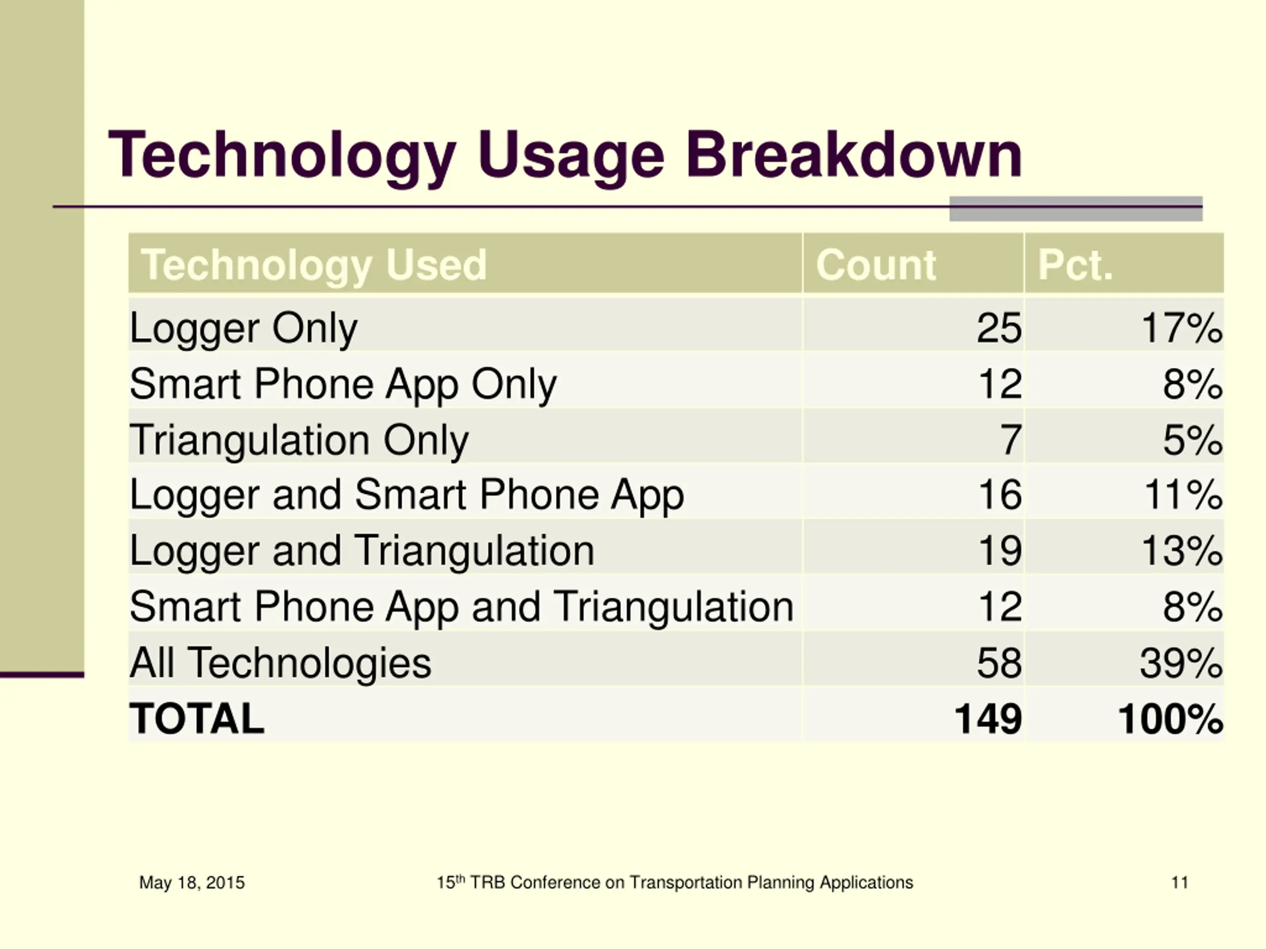 Technology Usage Breakdown Technology Used Logger Only Smart Phone App Only Triangulation Only Triangulation Only Logger and Smart Phone App Logger and Triangulation Smart Phone App and Triangulation Smart Phone App and Triangulation All Technologies TOTAL Technology Used Logger Only Smart Phone App Only Smart Phone App Only Triangulation Only Logger and Smart Phone App Logger and Triangulation Technology Used Logger Only Count Count Count Pct. Pct. Pct. 25 12 7 7 16 19 12 12 58 149 25 12 12 25 17% 8% 5% 5% 11% 13% 8% 8% 39% 100% 17% 8% 8% 5% 11% 13% 17% 7 16 19 TOTAL TOTAL 149 149 100% 100% 15th TRB Conference on Transportation Planning Applications 11 May 18, 2015