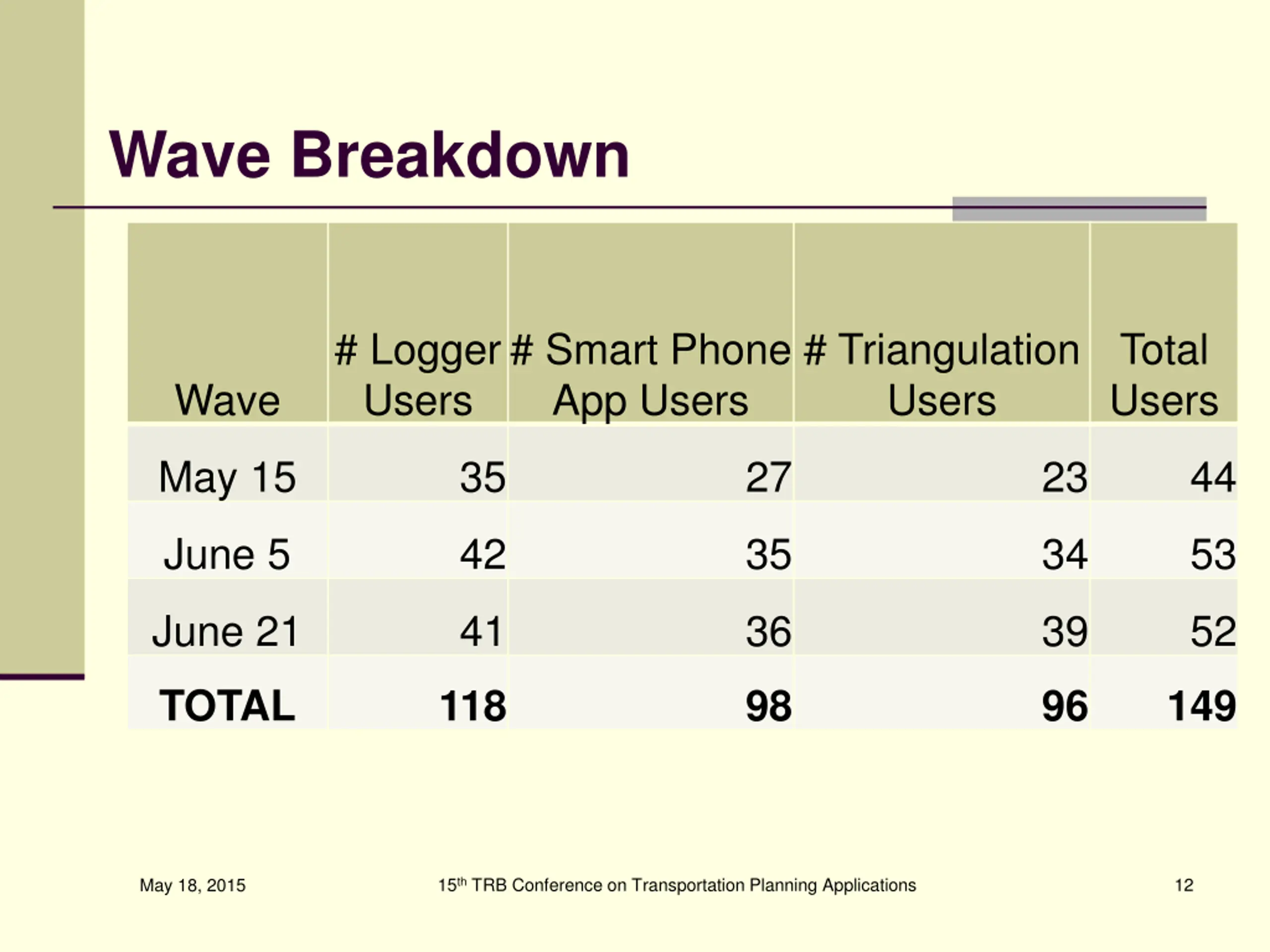 Wave Breakdown # Logger Users # Smart Phone App Users # Triangulation Users Total Users Wave May 15 35 27 23 44 June 5 42 35 34 53 June 21 41 36 39 52 TOTAL 118 98 96 149 15th TRB Conference on Transportation Planning Applications 12 May 18, 2015