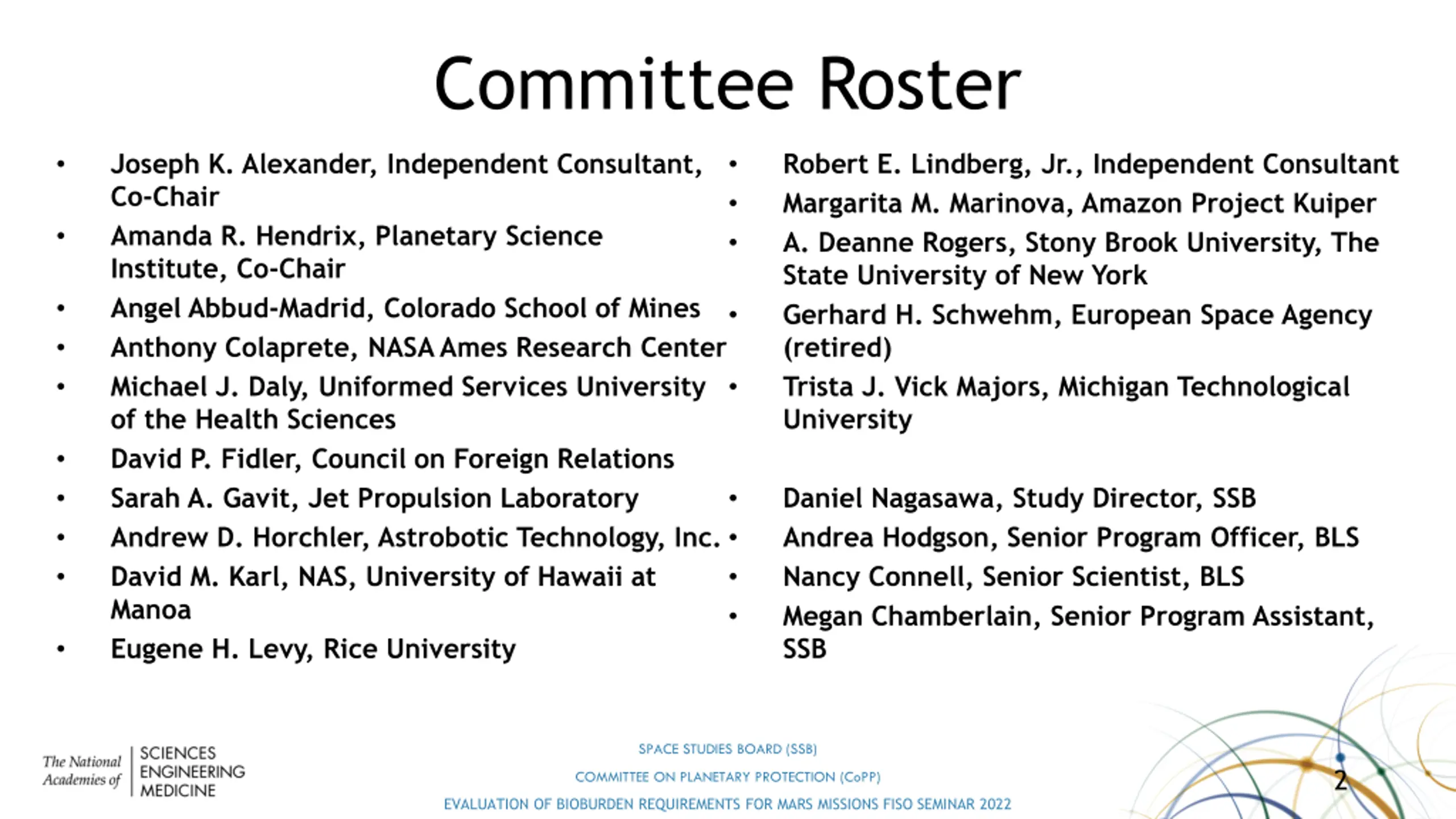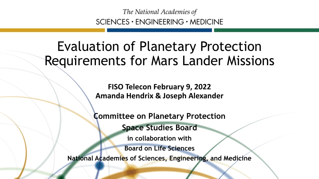 Evaluation of Planetary Protection Requirements for Mars Lander Missions FISO Telecon February 9, 2022 Amanda Hendrix & Joseph Alexander Committee on Planetary Protection Space Studies Board in collaboration with Board on Life Sciences National Academies of Sciences, Engineering, and Medicine