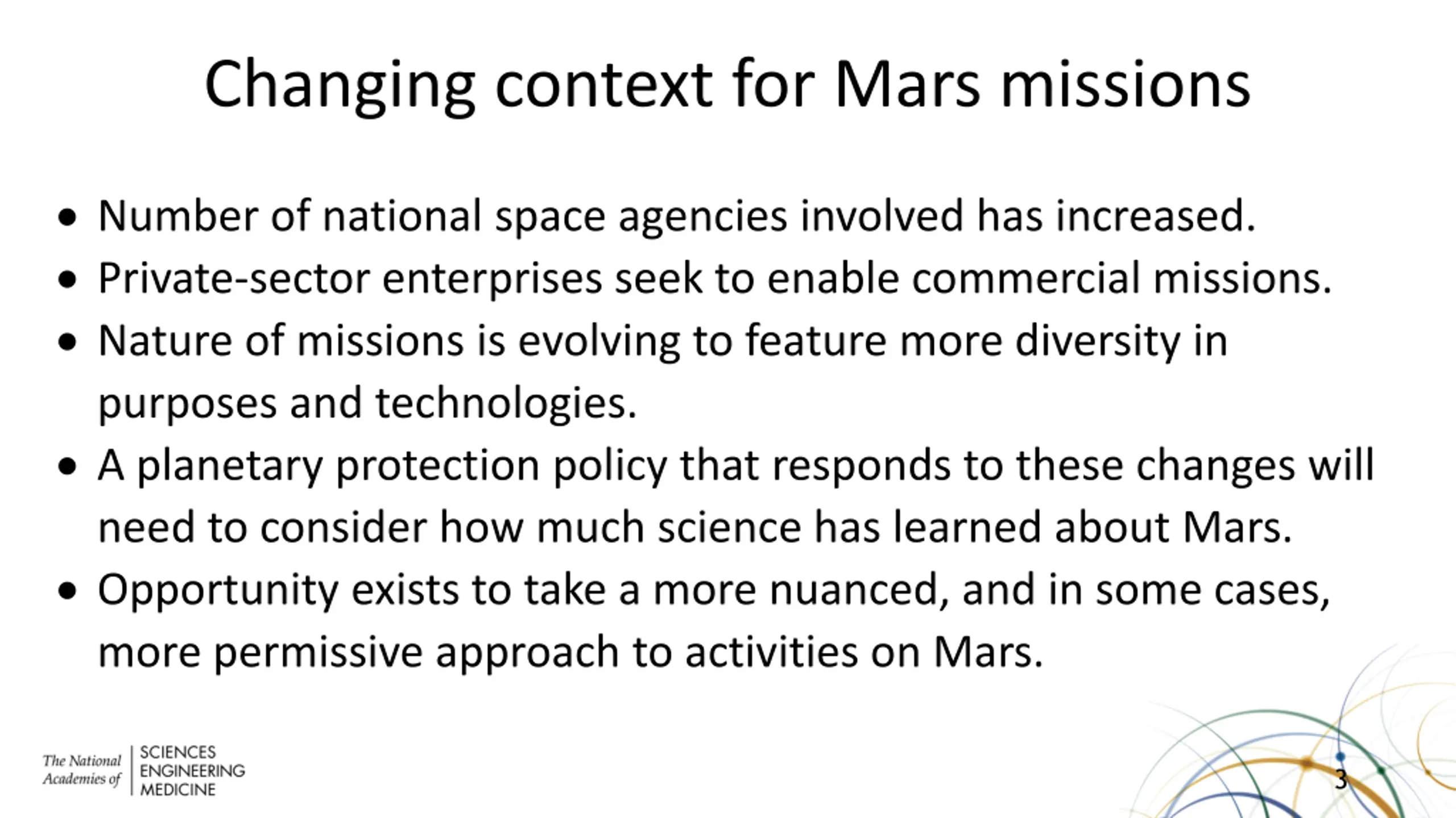 Changing context for Mars missions Number of national space agencies involved has increased. Private-sector enterprises seek to enable commercial missions. Nature of missions is evolving to feature more diversity in purposes and technologies. A planetary protection policy that responds to these changes will need to consider how much science has learned about Mars. Opportunity exists to take a more nuanced, and in some cases, more permissive approach to activities on Mars. 3
